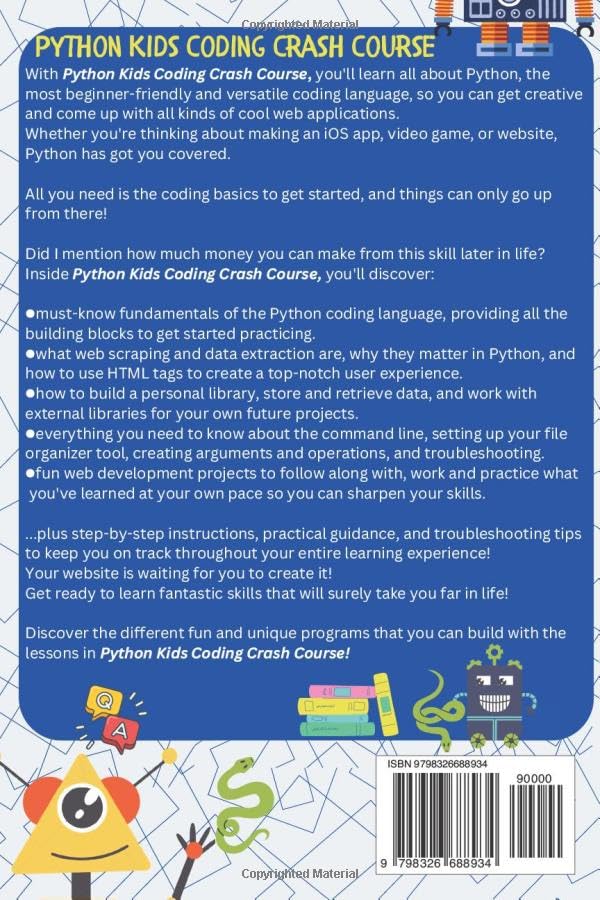Do you get excited about the idea of using your creativity to build software from scratch? Does it fascinate you to learn how websites and mobile apps are actually made? If you want to discover exactly how to create your own web applications based on your interests, then Python Kids Coding Crash Course has just the right lessons for you! Maybe you enjoy building model planes or robots, taking apart toy pieces and rebuilding it, or simply love playing games on your phone. Does this sound like you? If it does, then engineering is your game. Developing software opens doors to endless opportunities to build whatever you want, whenever you want. With Python Kids Coding Crash Course, you’ll learn all about Python, the most beginner-friendly and versatile coding language, so you can get creative and come up with all kinds of cool web applications. Whether you’re thinking about making an iOS app, video game, or website, Python has got you covered. All you need are the coding basics to get you started, and things can only go up from there! Did I mention how much money you can make from this skill later in life? Inside Python Kids Coding Crash Course, you’ll discover: must-know fundamentals of the Python coding language, providing all the building blocks to get started practicing. what web scraping and data extraction are, why they matter in Python, and how to use HTML tags to create a top-notch user experience.