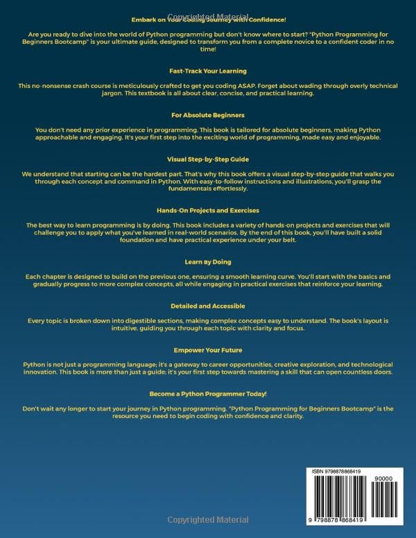 Transform from a complete novice to a confident Python programmer with our step-by-step bootcamp! Are you intrigued by the world of programming but feel overwhelmed by where to start? “Python Programming for Beginners Bootcamp” is your perfect companion. This no-nonsense crash course is specifically designed for beginners, making Python programming accessible, engaging, and, most importantly, achievable. With a visual, step-by-step guide, hands-on projects, and exercises, this book breaks down the complexities of Python into digestible, easy-to-understand pieces. Whether you’re looking to switch careers, enhance your skill set, or simply explore a new hobby, this book is your gateway to the exciting world of Python programming. Here is a taster of what you will find in the book: Step-by-Step Learning: Progress smoothly with clear, visual instructions that make learning Python straightforward and enjoyable. Hands-On Projects: Apply what you learn with real-world projects, solidifying your skills and building confidence. No Prior Experience Needed: Perfect for absolute beginners, with explanations tailored to those new to programming. Quick Progression: Designed to have you coding ASAP, ensuring a swift transition from learner to doer. Practical Exercises: Reinforce your understanding with exercises that challenge and engage you at every step. User-Friendly Approach: A friendly, approachable style that makes learning Python less intimidating and more fun. Versatile Skill Development: Gain skills that are in high demand in today’s tech-driven world. Future-Proof Your Career: Python skills are a valuable asset in many industries, opening doors to numerous opportunities. No excuses, we though of eveything! “Even if you think programming is too complex, our book simplifies Python in a way that’s digestible and easy to grasp.” “Even if you’re short on time, this crash course is designed to get you coding quickly with efficient learning methods.” “Even if you’ve struggled with other programming languages, Python’s simplicity and our clear guidance make it accessible.” “Even if you doubt your ability to learn coding, our step-by-step approach ensures you gain confidence and skills.” Start your journey in Python programming today – grab your copy of ‘Python Programming for Beginners Bootcamp’ and unlock your coding potential!