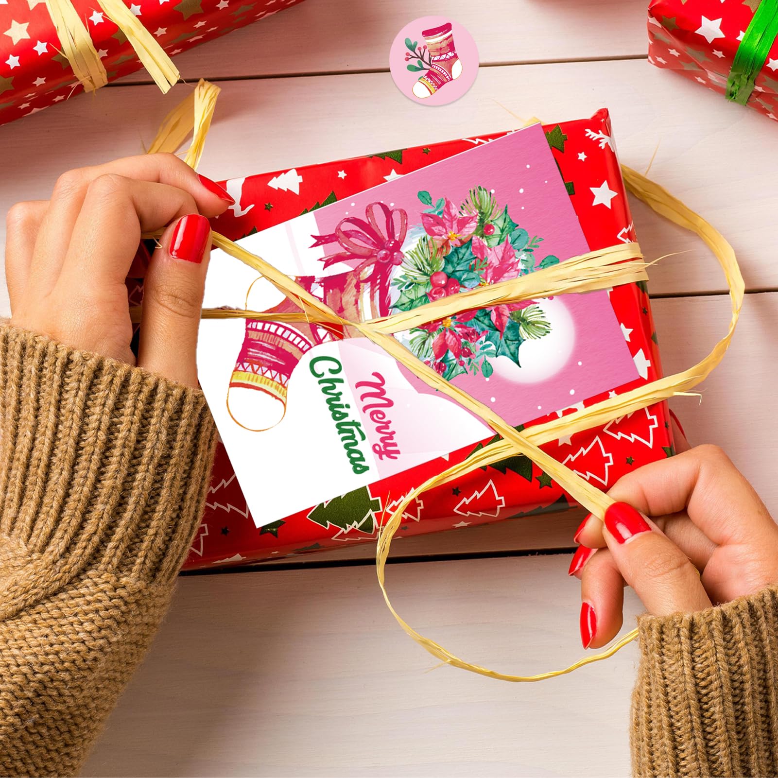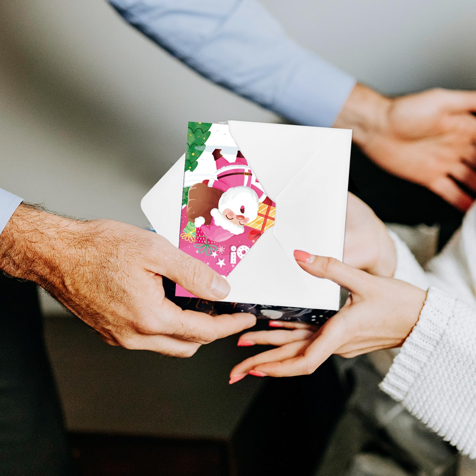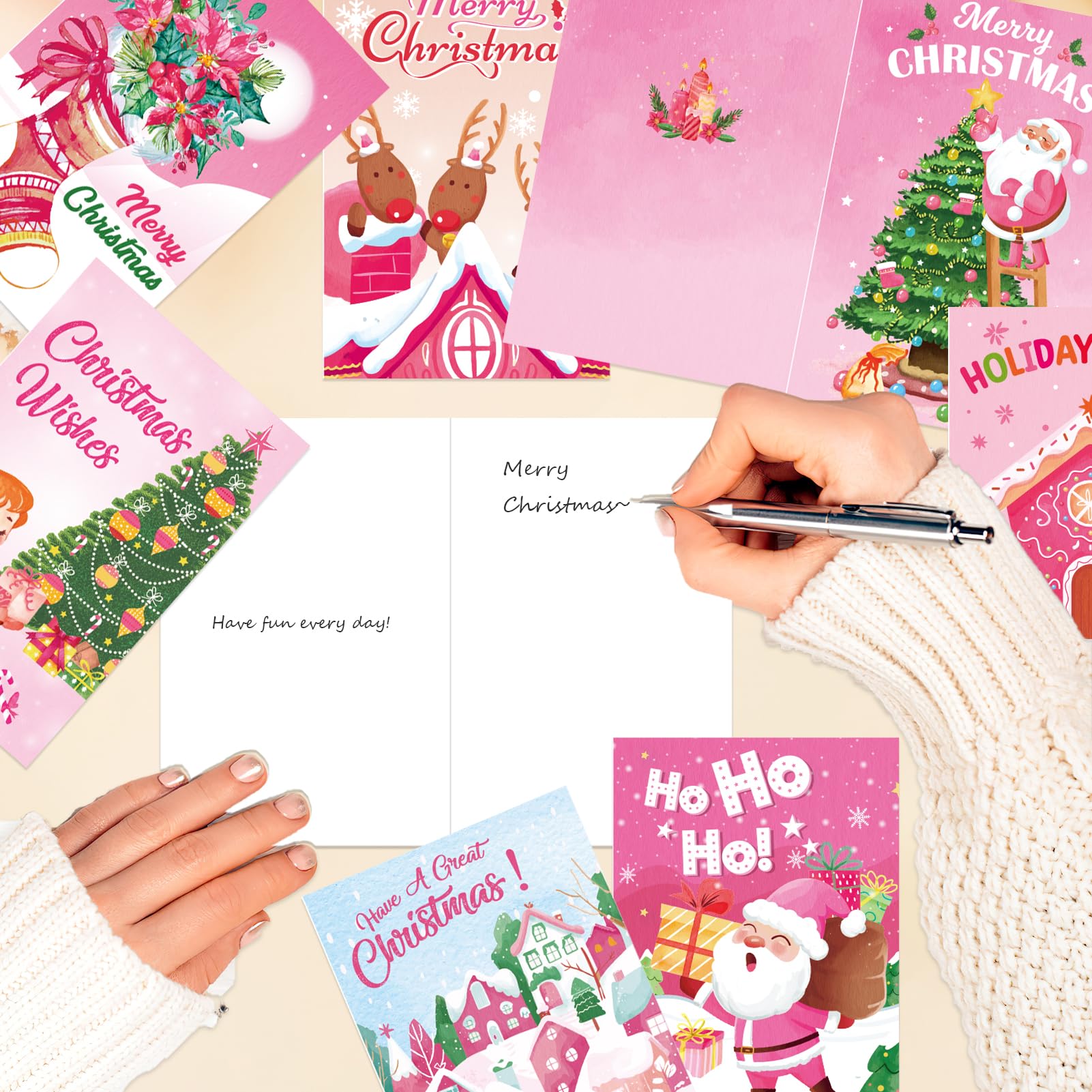 - [(Pink Pattern Design)] Our Merry Christmas cards have 12 different classic Christmas designs, including Christmas tree, socks, Santa Claus and more pink patterns.With its vibrant colors and intricately-patterned details, it is sure to capture the attention of your recipients.
