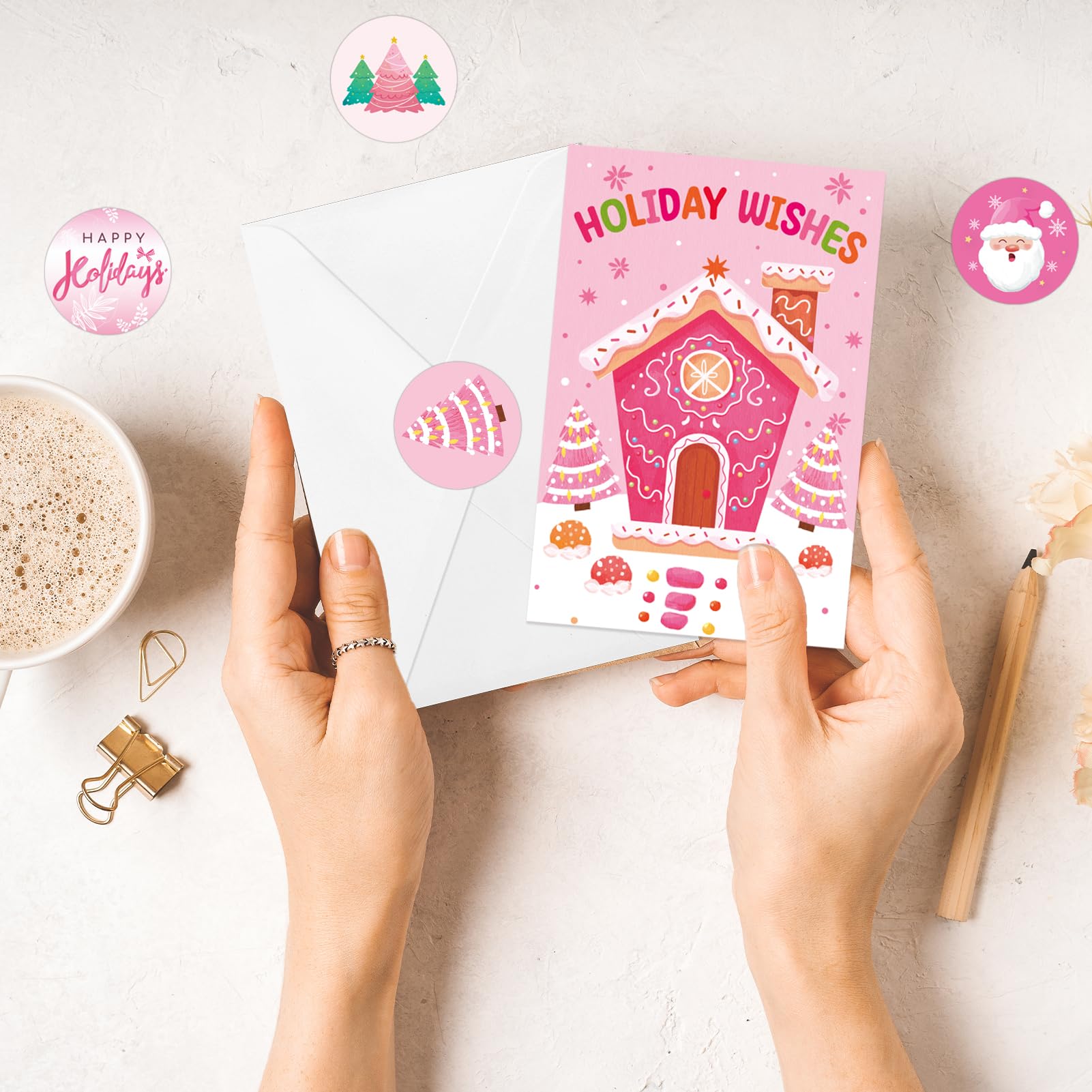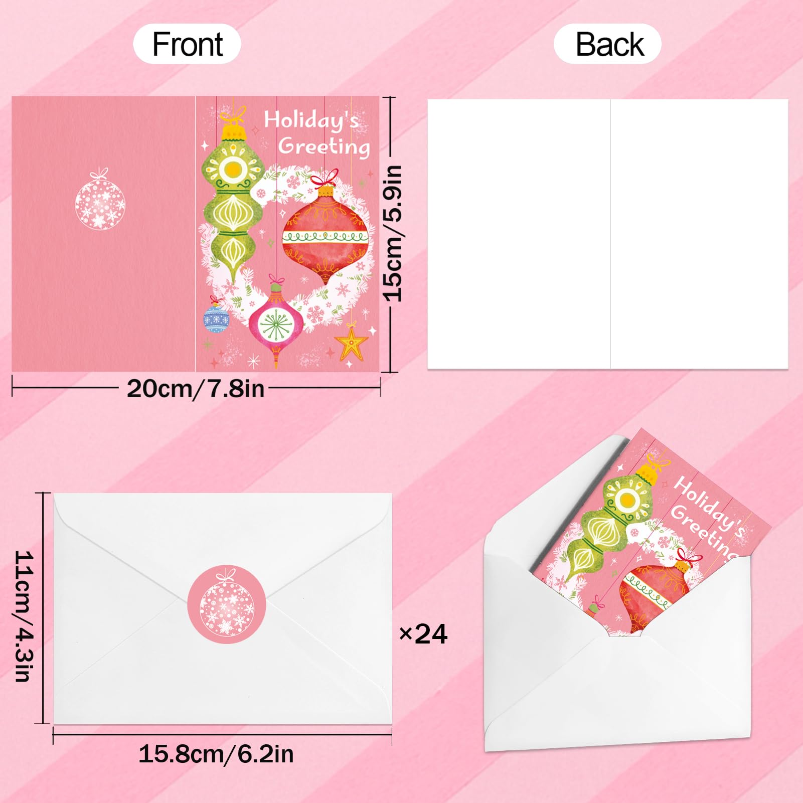 - [(Christmas Greeting Cards)] Our packaging includes 24pcs pink xmas greeting cards with corresponding stickers and white envelopes, which are convenient for you to use and save your time and effort.Each card is designed to spread joy and happiness to those who receive them.
