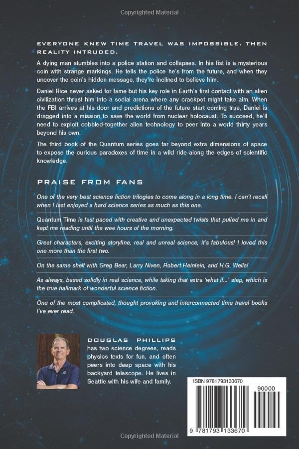 Everyone knew time travel was impossible. Then reality intruded. A dying man stumbles into a police station and collapses. In his fist is a mysterious coin with strange markings. He tells the police he’s from the future, and when they uncover the coin’s hidden message they’re inclined to believe him. Daniel Rice never asked for fame but his key role in Earth’s first contact with an alien civilization thrust him into a social arena where any crackpot might take aim. When the FBI arrives at his door and predictions of the future start coming true, Daniel is dragged into a mission to save the world from nuclear holocaust. To succeed, he’ll need to exploit cobbled-together alien technology to peer into a world thirty years beyond his own. The third book of the Quantum series goes far beyond extra dimensions of space to expose the curious paradoxes of time in a wild ride along the edges of scientific knowledge.