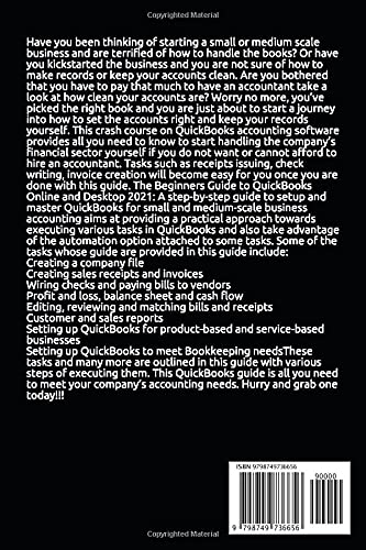 Description Have you been thinking of starting a small or medium-scale business and are terrified of how to handle the books? Or have you kickstarted the business and you are not sure of how to make records or keep your accounts clean? Are you bothered that you have to pay that much to have an accountant take a look at how clean your accounts are? Worry no more, you’ve picked the right book and you are just about to start a journey into how to set the accounts right and keep your records yourself. This crash course on QuickBooks accounting software provides all you need to know to start handling the company’s financial sector yourself if you do not want or cannot afford to hire an accountant. Tasks such as receipts issuing, check writing, invoice creation will become easy for you once you are done with this guide. The Beginners Guide to QuickBooks Online and Desktop 2021: A step-by-step guide to setup and master QuickBooks for small and medium-scale business accounting aims at providing a practical approach towards executing various tasks in QuickBooks and also take advantage of the automation option attached to some tasks. Some of the tasks whose guide are provided in this guide include: Creating a company file Creating sales receipts and invoices Wiring checks and paying bills to vendors Profit and loss, balance sheet and cash flow Editing, reviewing and matching bills and receipts Customer and sales reports Setting up QuickBooks for product-based and service-based businesses Setting up QuickBooks to meet Bookkeeping needs These tasks and many more are outlined in this guide with various steps of executing them. This QuickBooks guide is all you need to meet your company’s accounting needs. Hurry and grab one today by scrolling up and clicking on the BUY NOW button.