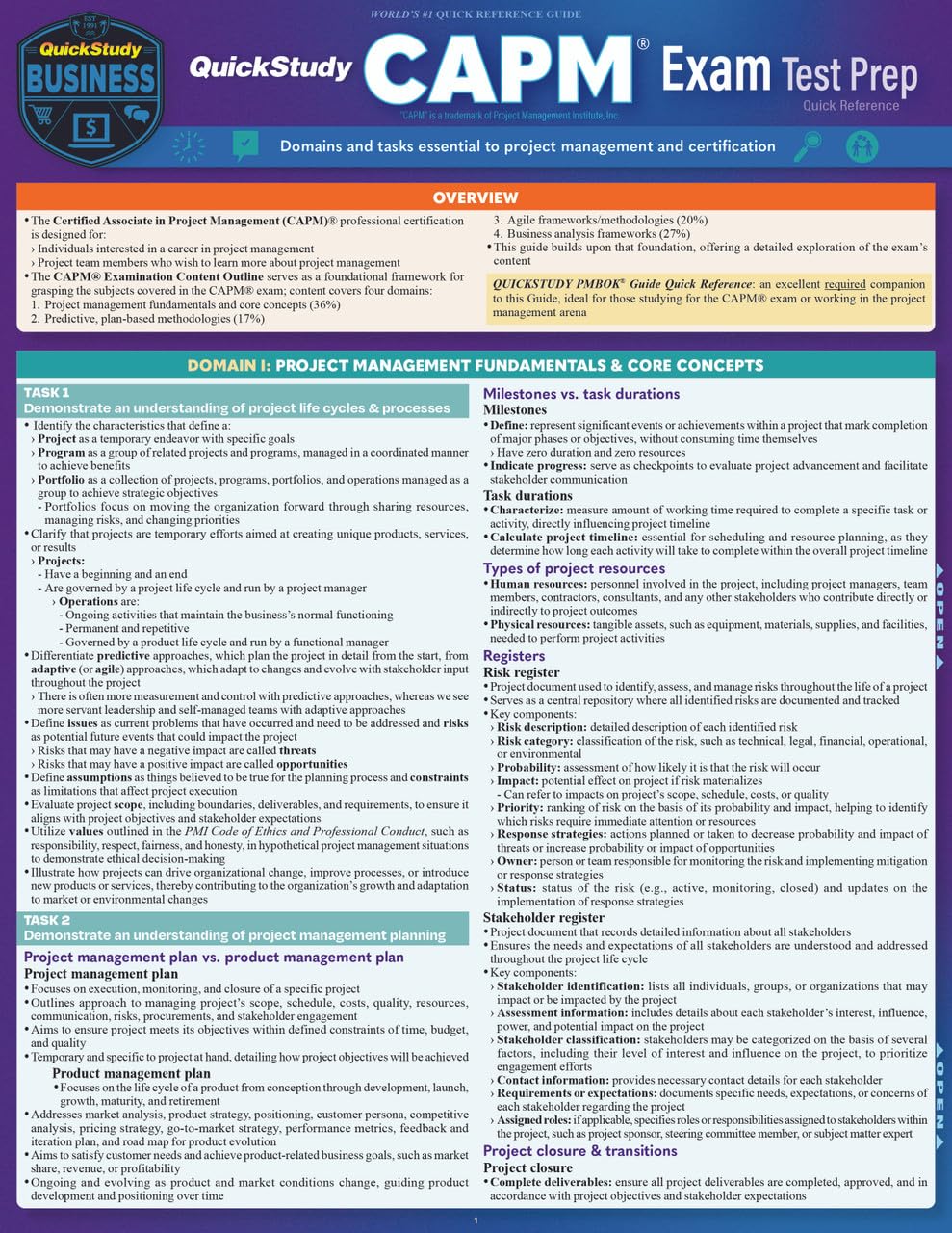 Essential test prep for the Certified Associate in Project Management (CAPM(r)) exam and handy reference to the exam content outline domains and tasks for test-takers, professionals, and teams working in project management. This six page laminated quick reference guide is authored by expert and trainer Aileen Ellis, PgMP(r), PMP(r) whose mission is to provide students the tools to gain certification in skills proven effective and highly valued by businesses worldwide. Ms. Ellis’s goal is for professionals to understand processes and interactions with limited memorization which she has been doing for 25 years through workshops, her training material, and books. With experience working with groups and individuals she knows what you need to succeed and has pulled the most important facts together in our famous QuickStudy format. This is a perfect tool for project teams to have on-hand so key aspects of the process can be referred to and referenced quickly and easily keeping the team in synch. For all of this, at this price, you cannot miss having this guide in your toolbox for testing or for team use. 6 page laminated reference includes: Domain I: Project Management Fundamentals & Core Concepts Task 1 Demonstrate an understanding of project life cycles & processes Task 2 Demonstrate an understanding of project management planning Task 3 Demonstrate an understanding of project roles & responsibilities Task 4 Determine how to follow & execute planned strategies or frameworks Task 5 Demonstrate an understanding of common problem-solving tools & techniques Domain II: Predictive, Plan-Based Methodologies Task 1 Explain when it’s appropriate to use a predictive, plan-based approach Task 2 Demonstrate an understanding of a project management plan schedule Domain III: Agile Frameworks/Methodologies Task 1 Explain when it’s appropriate to use an adaptive approach Task 2 Determine how to plan project iterations Task 3 Determine how to document project controls for an adaptive project Domain IV: Business Analysis (BA) Frameworks Task 1 Demonstrate an understanding of BA roles & responsibilities Task 2 Determine how to conduct stakeholder communication Task 3 Determine how to gather requirements Task 4 Demonstrate an understanding of product road maps Task 5 Determine how project methodologies influence BA processes Task 6 Validate requirements through product delivery