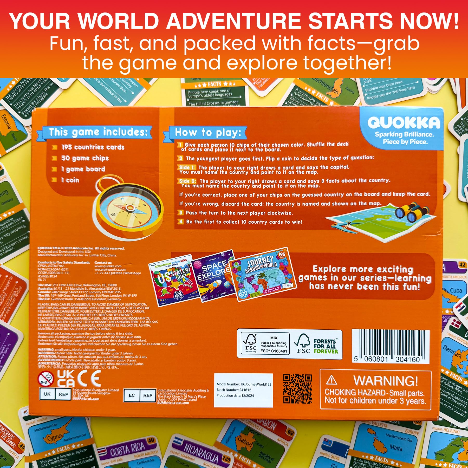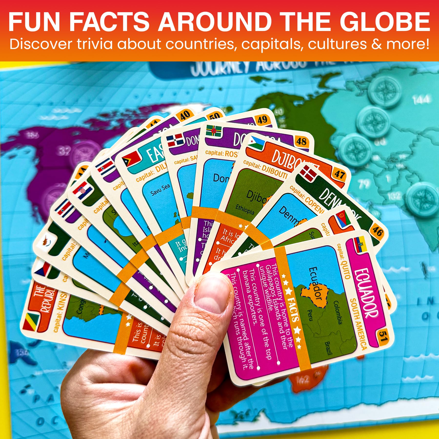 - ALL-IN-ONE ADVENTURE SET: Includes 195 country cards, 1 world map game board, 50 player chips, 1 coin, and easy-to-follow instructions; Durable components and colorful packaging make it a great educational gift for birthdays, holidays, or travel
