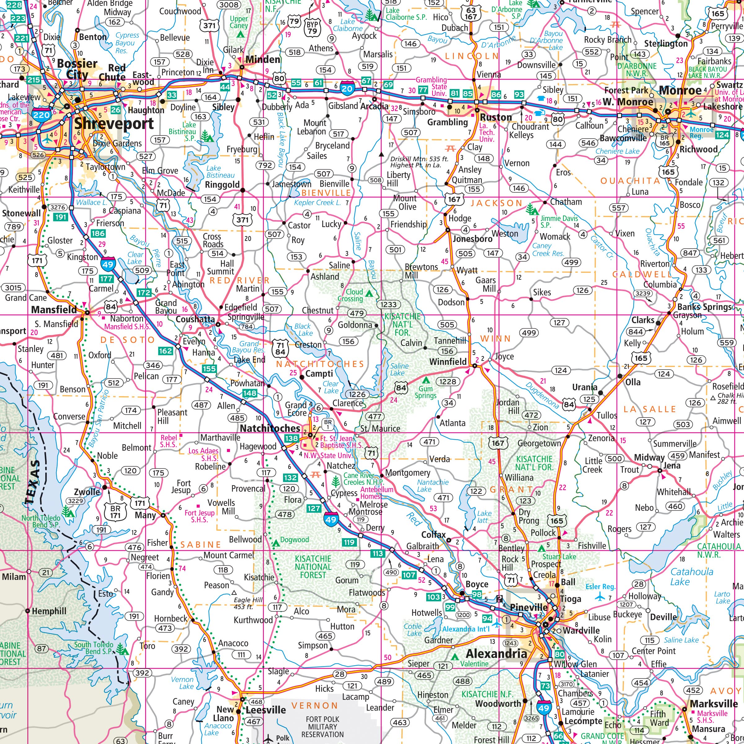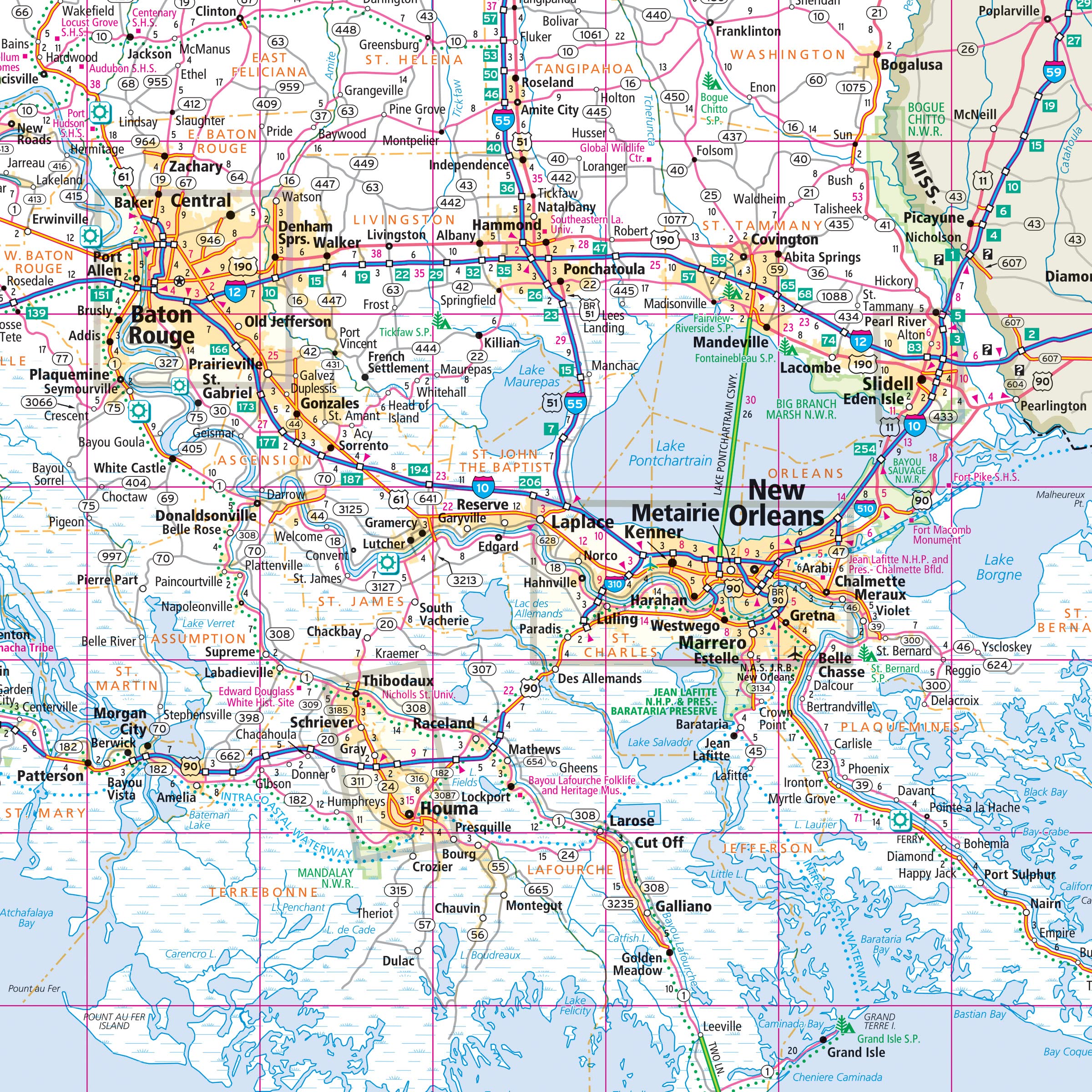 This map of Louisiana provides a visual aid for learning state geography, transportation routes, and points of interest.