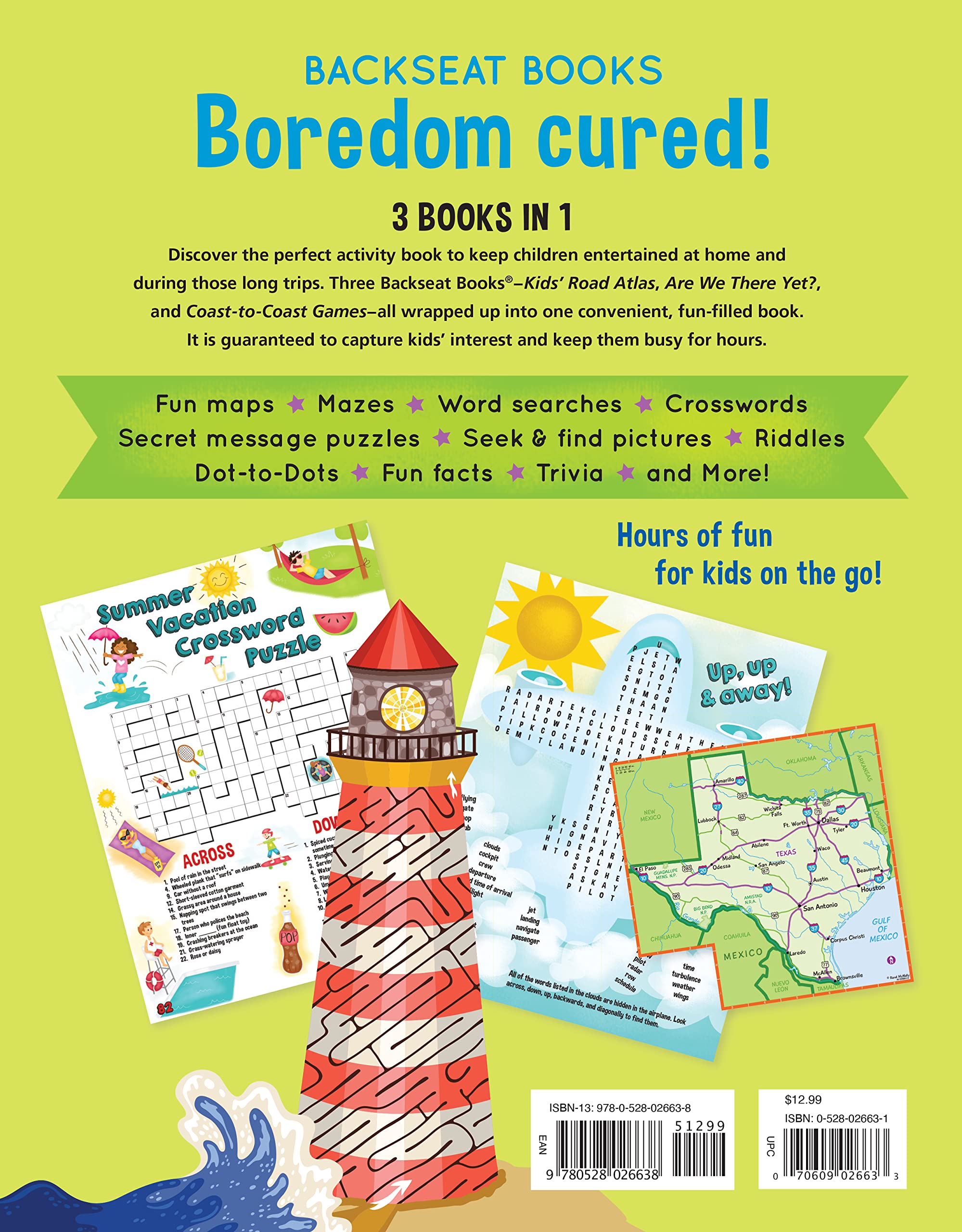 This 3-in-1 book combines the best of The Kids’ Road Atlas, Are We There Yet?, and Coast-to-Coast Games–all packed together into one kid-friendly, convenient take-along. It’s ready for travel, guaranteed to capture kids’ interest and keep them entertained for hours. Includes: – Real road maps of all 50 states, simplified for kids. – Features cities, national parks, and popular attractions in six main US regions. – Full of crossword puzzles, dot-to-dots, mazes, word scrambles, travels games, fun facts, trivia, and more. – Answer keys are included in the back of the book. – Product Details: Dimensions:8.5 x 19.875. – 224 Pages