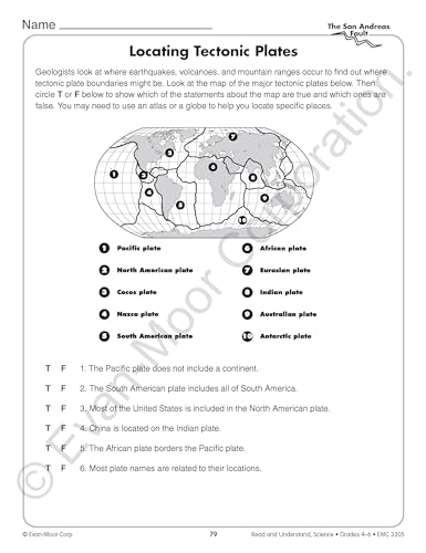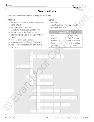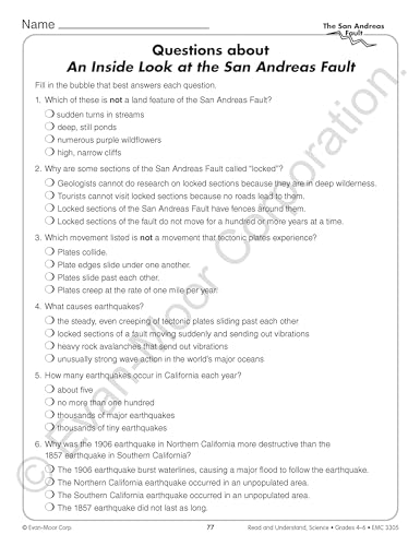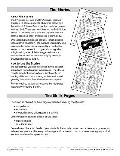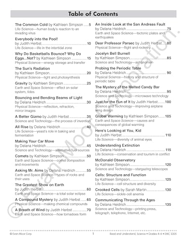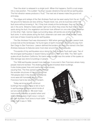 Read and Understand, Science, Grades 4-6 presents stories that range from high-third grade to high-sixth grade in readability. Topics presented include: Life Science: the common cold, tide pool life, yeast, diversity of animal eyes, conflict of conservation and tourism, cell structure and diversity, sickle-cell anemia. Physical Science: potential and kinetic energy, types of solar radiation, light reflection and refraction, chemical compounds, flight and rocketry, the periodic table of elements. Earth and Space Science: gravity, comets, types of rocks, total solar eclipse, tornadoes, tectonic plates and earthquakes, global warming. Science and Technology: the process of invention, alternative fuel sources, invention of the microwave, improving airplane wing design, global warming, telescopes, communications devices through the years. This resource contains teacher support pages, reproducible student pages, and an answer key. This is a reproducible resource (photocopying of lessons is permitted) for single classroom or individual home use only. About Evan-Moor A leader in PreK-8 educational publishing, Evan-Moor has been a trusted partner of teachers and parents for over 40 years. Our mission is helping children learn, and we do this by creating resources that motivate children to learn important skills and concepts across the curriculum while also inspiring a love of learning.