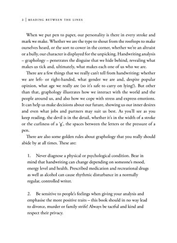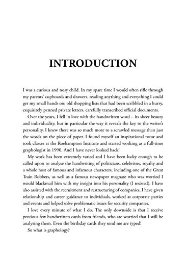 AS SEEN ON BBC BREAKFAST Find out what your handwriting says about you! Handwriting is something of a dying art nowadays, as we tap messages to each other day after day. But handwriting analysis can divulge everything from a person’s timidity to their ambition, from their desire to please to their need to control. In fact, so revealing is your writing that in Japan all CVs are still written by hand. Written by the UK’s leading handwriting expert, Reading Between the Lines will show you how to judge someone’s handwriting as a whole and how to examine it in detail. Because every aspect of penmanship – the height of an ‘h’, the curliness of a ‘g’, the pressure of the pen on the paper – is a collection of signals that we are giving out without meaning to. The way we write can tell the world a huge amount; sometimes more than the things we write about. Our handwriting exposes how we interact with the world and the people around us, and also how we cope with stress and express emotions. It can help us make choices for our future, showing us what our desires are, and even what jobs and partners may suit us best. Using real-life examples, including celebrity samples, you will be challenged to put your new-found knowledge to the test. By the end of the book you will have amassed a wealth of knowledge that will help you understand human nature – including your own – in all its colours.