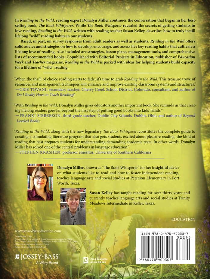 In Reading in the Wild, reading expert Donalyn Miller continues the conversation that began in her bestselling book, The Book Whisperer. While The Book Whisperer revealed the secrets of getting students to love reading, Reading in the Wild, written with reading teacher Susan Kelley, describes how to truly instill lifelong “wild” reading habits in our students. Based, in part, on survey responses from adult readers as well as students, Reading in the Wild offers solid advice and strategies on how to develop, encourage, and assess five key reading habits that cultivate a lifelong love of reading. Also included are strategies, lesson plans, management tools, and comprehensive lists of recommended books. Copublished with Editorial Projects in Education, publisher of Education Week and Teacher magazine, Reading in the Wild is packed with ideas for helping students build capacity for a lifetime of “wild” reading. “When the thrill of choice reading starts to fade, it’s time to grab Reading in the Wild. This treasure trove of resources and management techniques will enhance and improve existing classroom systems and structures.” –Cris Tovani, secondary teacher, Cherry Creek School District, Colorado, consultant, and author of Do I Really Have to Teach Reading? “With Reading in the Wild, Donalyn Miller gives educators another important book. She reminds us that creating lifelong readers goes far beyond the first step of putting good books into kids’ hands.” –Franki Sibberson, third-grade teacher, Dublin City Schools, Dublin, Ohio, and author of Beyond Leveled Books “Reading in the Wild, along with the now legendary The Book Whisperer, constitutes the complete guide to creating a stimulating literature program that also gets students excited about pleasure reading, the kind of reading that best prepares students for understanding demanding academic texts. In other words, Donalyn Miller has solved one of the central problems in language education.” –Stephen Krashen, professor emeritus, University of Southern California