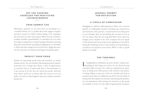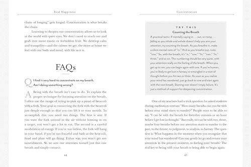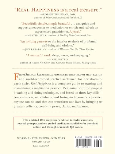 A New York Times best seller–now revised and updated with new exercises and guided meditations. “An inviting gateway to the interior territory of profound well-being and wisdom.”–Jon Kabat-Zinn, author of Wherever You Go, There You Are From Sharon Salzberg, a pioneer in the field of meditation and world-renowned teacher acclaimed for her down-to-earth style, Real Happiness is a complete guide to starting and maintaining a meditation practice. Beginning with the simplest breathing and sitting techniques, and based on three key skills–concentration, mindfulness, and lovingkindness–it’s a practice anyone can do and that can transform our lives by bringing us greater resiliency, creativity, peace, clarity, and balance. This updated 10th anniversary edition includes exercises, journal prompts, and ten guided meditations available for download online and through scannable QR codes.