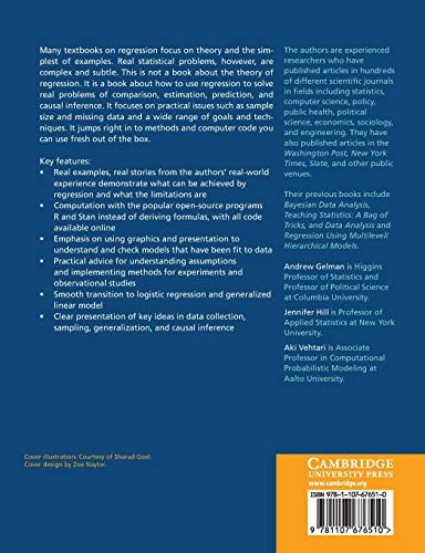 Most textbooks on regression focus on theory and the simplest of examples. Real statistical problems, however, are complex and subtle. This is not a book about the theory of regression. It is about using regression to solve real problems of comparison, estimation, prediction, and causal inference. Unlike other books, it focuses on practical issues such as sample size and missing data and a wide range of goals and techniques. It jumps right in to methods and computer code you can use immediately. Real examples, real stories from the authors’ experience demonstrate what regression can do and its limitations, with practical advice for understanding assumptions and implementing methods for experiments and observational studies. They make a smooth transition to logistic regression and GLM. The emphasis is on computation in R and Stan rather than derivations, with code available online. Graphics and presentation aid understanding of the models and model fitting.