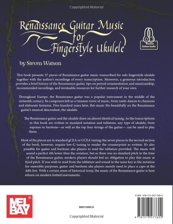 This book presents 37 pieces of Renaissance guitar music transcribed for solo fingerstyle ukulele together with the author’s recordings of every transcription. Moreover, a generous introduction provides a brief history of the Renaissance guitar, tips on period ornamentation and musicianship, recommended recordings, and invaluable resources for further research of your own. Throughout Europe, the Renaissance guitar was a popular instrument in the middle of the sixteenth century. Its composers left us a treasure-trove of music, from rustic dances to chansons and elaborate fantasias. Five-hundred years later, this music fits beautifully on the Renaissance guitar’s musical descendant, the ukulele. The Renaissance guitar and the ukulele share an almost identical tuning. As the transcriptions in this book are written in standard notation and tablature, any type of ukulele, from soprano to baritone–as well as the top four strings of the guitar– can be used to play them. Most of the pieces are in standard gCEA or GCEA tuning; the seven pieces in the second section of the book, however, require low-G tuning to render the counterpoint as written. It’s also possible for guitar and baritone uke players to read the tablature provided. The music will sound a perfect 4th lower than the notation, but as there was no standard pitch in the time of the Renaissance guitar, modern players should feel no obligation to play this music at fixed pitch. If you wish to read from the tablature and sound in the same key as the notation for ensemble purposes, guitar and baritone uke players merely need to place a capo at the fifth fret. With a certain sense of historical irony, the music of the Renaissance guitar is here reborn on modern fretted instruments.