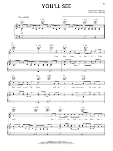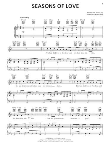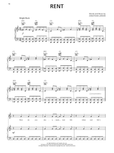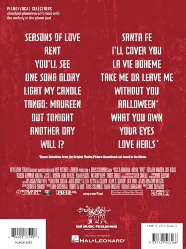 Celebrate the power and passion of Broadway’s most influential rock musical with this official Rent: Movie Vocal Selections songbook. Based on Jonathan Larson’s Tony and Pulitzer Prize-winning musical, this collection brings the unforgettable energy of the Rent film adaptation into the hands of singers, pianists, and guitarists. Each of the 18 songs is arranged for piano, vocal, and guitar (P/V/G), with accurate chords, lyrics, and piano accompaniment–making it ideal for solo performance, classroom use, or musical theatre study. * * This sheet music edition is a must-have for Broadway enthusiasts and vocal performers looking to explore the emotionally charged and socially resonant music of Rent. From power anthems to heartfelt ballads, Larson’s music blends rock, pop, and theatrical storytelling in a way that continues to connect with audiences across generations. The included arrangements are user-friendly and accessible for intermediate performers while maintaining the dramatic impact of the originals. * * Whether you are preparing for auditions, rehearsals, or just want to sing along to the soundtrack, this Rent songbook offers rich vocal content and authentic arrangements. It also makes a thoughtful gift for pianists, vocalists, or musical theatre lovers, and is a useful music teacher resource for exploring vocal performance in contemporary musicals. * * Songs Included: * Another Day * I’ll Cover You * Rent * Seasons of Love * Take Me or Leave Me * What You Own * Without You * You’ll See * Your Eyes * La Vie Boheme * Light My Candle * Love Heals * One Song Glory * Out Tonight * Santa Fe * Tango: Maureen * Will I? * Halloween