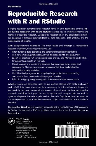 Bringing together computational research tools in one accessible source, Reproducible Research with R and RStudio guides you in creating dynamic and highly reproducible research. Suitable for researchers in any quantitative empirical discipline, it presents practical tools for data collection, data analysis, and the presentation of results. With straightforward examples, the book takes you through a reproducible research workflow, showing you how to use: R for dynamic data gathering and automated results presentation knitr for combining statistical analysis and results into one document LaTeX for creating PDF articles and slide shows, and Markdown and HTML for presenting results on the web Cloud storage and versioning services that can store data, code, and presentation files; save previous versions of the files; and make the information widely available Unix-like shell programs for compiling large projects and converting documents from one markup language to another RStudio to tightly integrate reproducible research tools in one place Whether you’re an advanced user or just getting started with tools such as R and LaTeX, this book saves you time searching for information and helps you successfully carry out computational research. It provides a practical reproducible research workflow that you can use to gather and analyze data as well as dynamically present results in print and on the web. Supplementary files used for the examples and a reproducible research project are available on the author’s website.