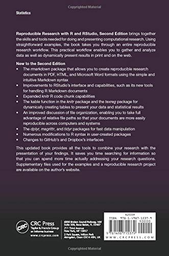 All the Tools for Gathering and Analyzing Data and Presenting Results Reproducible Research with R and RStudio, Second Edition brings together the skills and tools needed for doing and presenting computational research. Using straightforward examples, the book takes you through an entire reproducible research workflow. This practical workflow enables you to gather and analyze data as well as dynamically present results in print and on the web. New to the Second Edition The rmarkdown package that allows you to create reproducible research documents in PDF, HTML, and Microsoft Word formats using the simple and intuitive Markdown syntax Improvements to RStudio’s interface and capabilities, such as its new tools for handling R Markdown documents Expanded knitr R code chunk capabilities The kable function in the knitr package and the texreg package for dynamically creating tables to present your data and statistical results An improved discussion of file organization, enabling you to take full advantage of relative file paths so that your documents are more easily reproducible across computers and systems The dplyr, magrittr, and tidyr packages for fast data manipulation Numerous modifications to R syntax in user-created packages Changes to GitHub’s and Dropbox’s interfaces Create Dynamic and Highly Reproducible Research This updated book provides all the tools to combine your research with the presentation of your findings. It saves you time searching for information so that you can spend more time actually addressing your research questions. Supplementary files used for the examples and a reproducible research project are available on the author’s website.