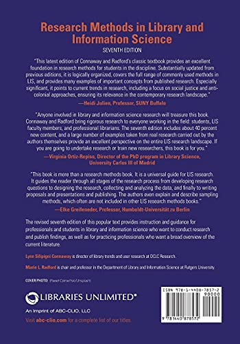 The seventh edition of this frequently adopted textbook features new or expanded sections on social justice research, data analysis software, scholarly identity research, social networking, data science, and data visualization, among other topics. It continues to include discipline experts’ voices. The revised seventh edition of this popular text provides instruction and guidance for professionals and students in library and information science who want to conduct research and publish findings, as well as for practicing professionals who want a broad overview of the current literature. Providing a broad introduction to research design, the authors include principles, data collection techniques, and analyses of quantitative and qualitative methods, as well as advantages and limitations of each method and updated bibliographies. Chapters cover the scientific method, sampling, validity, reliability, and ethical concerns along with quantitative and qualitative methods. LIS students and professionals will consult this text not only for instruction on conducting research but also for guidance in critically reading and evaluating research publications, proposals, and reports. As in the previous edition, discipline experts provide advice, tips, and strategies for completing research projects, dissertations, and theses; writing grants; overcoming writer’s block; collaborating with colleagues; and working with outside consultants. Journal and book editors discuss how to publish and identify best practices and understudied topics, as well as what they look for in submissions.