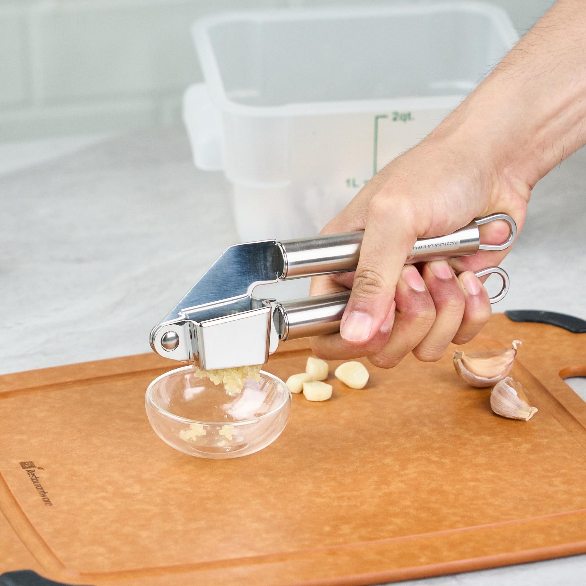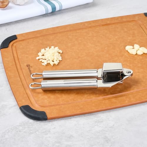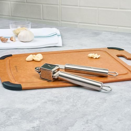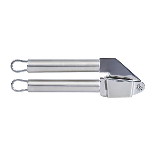 - SMOOTH OPERATION: The hinge mechanism of this stainless steel garlic presser ensures even pressure for thorough garlic mincing. Achieve perfectly crushed garlic every time!