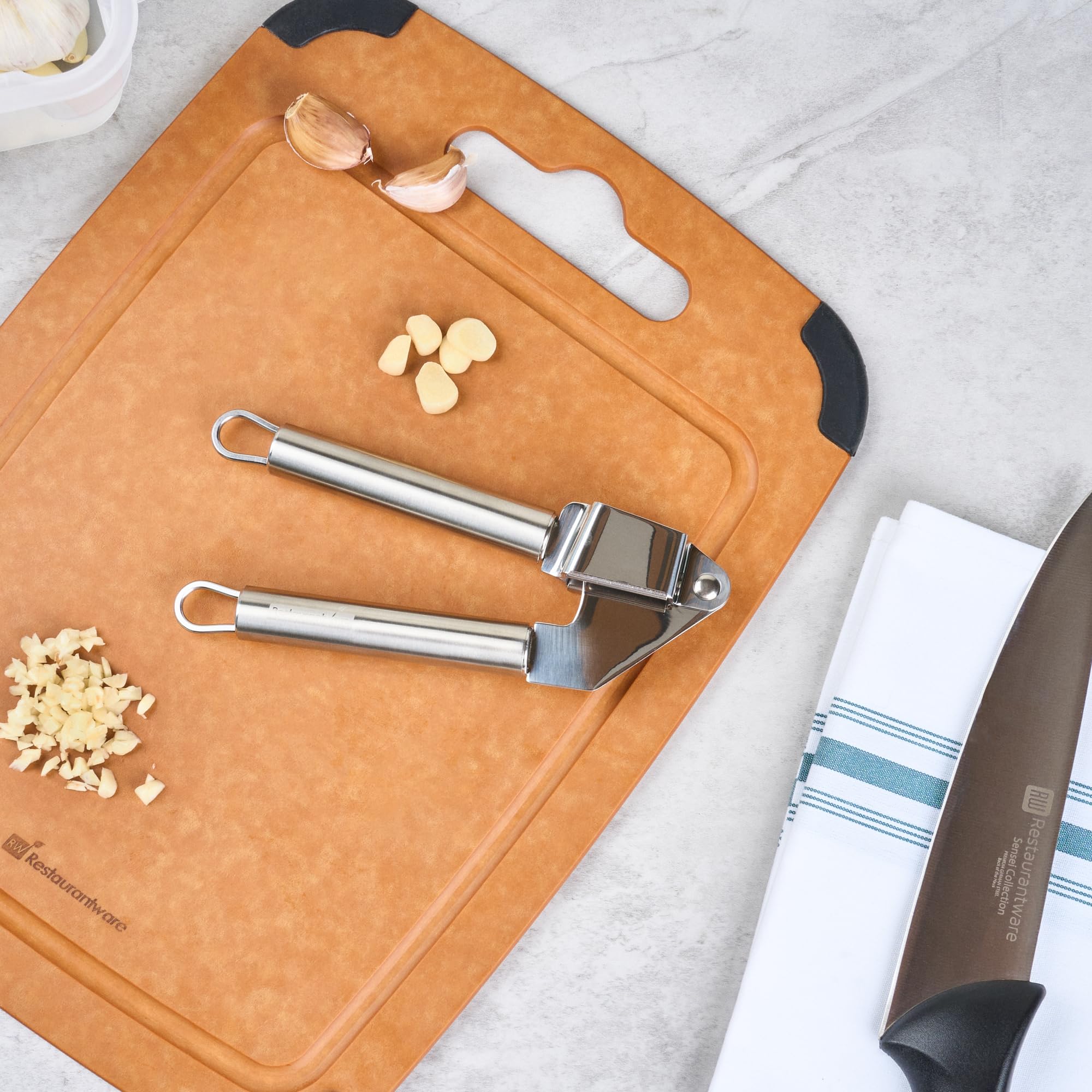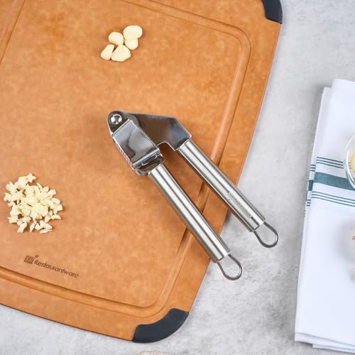 - STABLE HANDLING: This premium garlic press has a dual handle design, allowing one to handle to press while the other remains steady. Easily create minced garlic with minimal effort!