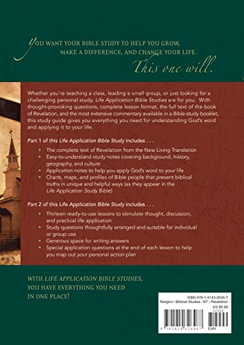 Revelation–13 lessons that give us hope as we face an uncertain future. Whether you are teaching a class, leading a small group, or just looking for a challenging personal study, Life Application Bible Studies are for you. With thought-provoking questions, complete lesson format, the full text from the Bible, and the most extensive commentary available in a Bible-study booklet, these study guides gives you everything you need to understand God’s Word and apply it to your life. Ideal for those looking for an application oriented approach to Bible study. Each title contains the following: An in-depth examination of the Bible book(s) in 13 lessons. The full NLT text and Life Application notes for the book(s) covered. Study notes that are easy to use and understand, covering background, history, geography, and culture. Charts, maps, and profiles of Bible characters that present biblical truths in unique and helpful ways. Special application questions at the end of each lesson to help you map out your personal action plan. Everything you need for study in one place.