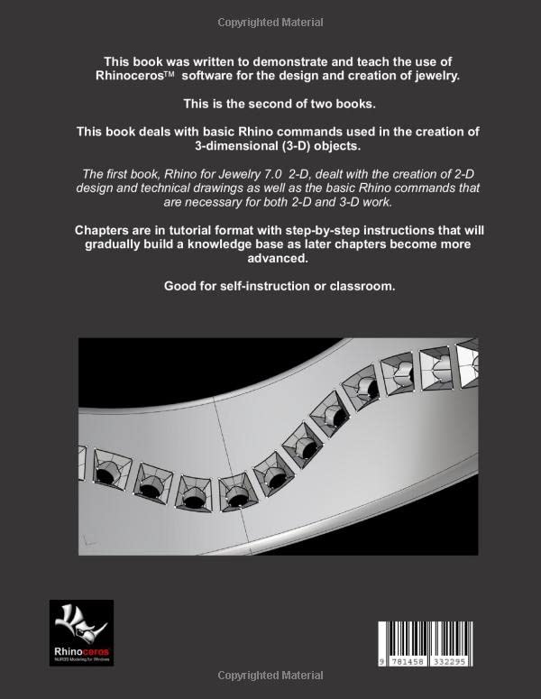 This book was written to demonstrate and teach the use of Rhinoceros 7.0 software for the design and creation of jewelry modeling. This is the second of two volumes.. This volume deals with basic Rhino commands and the creation of 3-dimensional (3-D) projects. Chapters are in tutorial format with step-by-step instructions that will gradually build a knowledge base as later chapters become more advanced. Good for self-instruction or classroom.