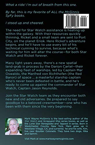 “What a ride! I’m completely out of breath.””By far, this is my favorite of ALL the McGinnis SyFy books.””I stood up and cheered.”The need for Star Watch assistance is heating up within the galaxy. With their resources quickly thinning, Ricket and a small team are sent to Port City, on the planet Eriok. Here Ricket’s adventure begins, and he’ll have to use every bit of his technical cunning to survive, because what’s waiting for him will alter the course–for both Star Watch and Ricket forever.Many light-years away, there’s a new spatial land-grab in process by the Darion Cartel–their expanding fleet of warships, led by Captain Mar Oswaldo, the Manfred von Richthofen (the Red Baron) of space … a masterful starship captain who’s never been defeated in battle, and he’s ready to come up against the commander of Star Watch, Captain Jason Reynolds.Join the Star Watch team as they encounter both new and old adversaries. Be prepared to say goodbye to a beloved crewmember–one who has been with them since the very beginning. Reviews: I Love Ricket / Book 2 of the Star Watch Box Set Series by Mark Wayne McGinnis He holds the key to all the technology and that’s what drives the story for me. I really like how the scrapyard ship has been upgraded through the books and the improvements Ricket has donated. His laid-back zen approach is also a perfect anchor for all the chaos that the rest of the group goes through. I’m glad MWM.- Dennis Daly This is one of the best books I’ve read in some time This is one of the best books I’ve read in some time. For those of you who are engineers, you will absolutely love this book. I enjoy all of the Scrapyard series of books but I must say that I think this is the very best of the series. I love that I can never guess where they are going with the plot. The stories are complex and exciting. I actually love other books of Mark, like his latest scifi military series of books, the UUS Hamilton series. Read and enjoy!!!- William C. Gibson Back for the future I’ve been reading science fiction on and off for almost 60 years, and some of my fondest memories are of the pulp-like works of Robert Heinlein and Andre Norton. Ricket, my first read by Mark Wayne McGinnis, strongly reminded me of those days of personal discovery of other universes. The premises, pacing, and resolutions kept my attention from start to finish, leaving me wanting more. Given McGinnis’s apparent productivity, I don’t think I’ll have to wait long. Even if Heinlein and Norton are unfamiliar names for you, keep Ricket in mind. It’s definitely worth a look.- Allan Farbman Thank you Mark, for the fun military scifi action adventure books I love all of Mark’s books: Scrapyard Ship, Star Watch, Ship Wrecked Stranded on an Alien Planet, Boy Gone, Galaxy Man, The Gun Ship, the Hidden Ship, Cloudwalkers, the UUS Hamilton, and the USS Jefferson. For this book, Ricket, Book 2 of the Star Watch series, the fun and adventure and space battles are here in full force. Thank you, Mark, for providing so much fun and entertainment over the years.- David This book and series are a good read / Captain Jason Reynolds, Boomer, Dira, Ricket / But to really enjoy it you have This book and series are a good read. But to really enjoy it you have to read from the first book on. Otherwise, you will miss the character development and not enjoy the subtleties and interaction of the many and various characters. Well worth the time to acquire the series from book one and read from the beginning of the series, specifically to understand the evolution of Ricket.- OnLIneShopper Ricket falls into the following categories: Metaphysical and Visionary, Galactic Empire, Alien Invasion, First Contact, Fun Space Adventure, Humorous SciFi, Space Exploration, Space Opera, Military Science Fiction, Space Fleet, Space Marine, Hard Sci-Fi
