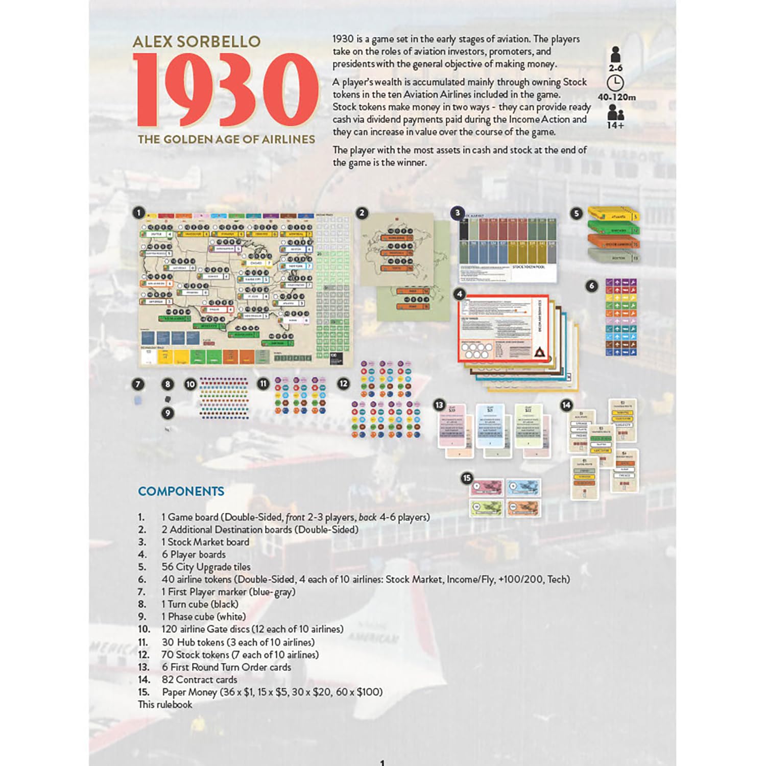 1930: The Golden Age of Airlines -1930 is a game set in the early stages of aviation. The players take on the roles of aviation investors, promoters, and presidents with the general objective of making money. A player’s wealth is accumulated mainly through owning Stock Tokens of stock in the ten Aviation Airlines included in the game. Stock Tokens make money in two ways – they can provide ready cash via dividend payments paid during the Income Action and they can increase in value over the course of the game. The player with the most assets in cash and stock at the end of the game is the winner. Designer: Alex Sorbello. Artist: Todd Sanders.