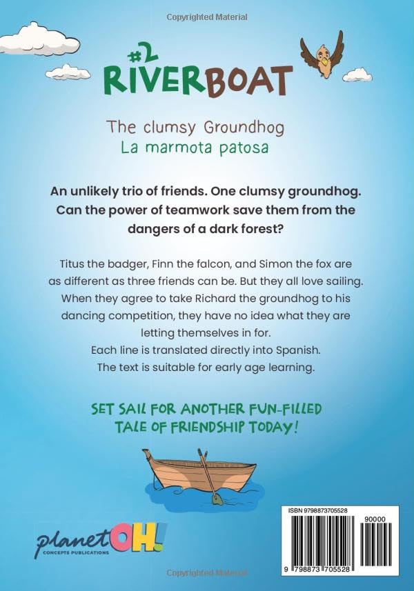 An unlikely trio of friends. One clumsy groundhog. And a dark forest full of dangers. Titus the badger, Finn the falcon, and Simon the fox are as different as three friends can be. But they all share the same love of sailing. When they agree to take Richard the groundhog to his dancing competition, they have no idea what they are letting themselves in for. The three friends are led into waters unknown by clumsy Richard in his quest to reach the competition. They get lost while trying to find their way through the tributaries of the river. How does Richard inadvertently help the friends and save them from a worse fate? Read this hilarious story to find out. Each line is translated into Spanish directly below for easy comprehension. The text is simple and suitable for early-age learning. This dual-language bedtime story is part of the series Riverboat which is designed to teach children new foreign words and phrases as you read to them. The Clumsy Groundhog is a beautifully illustrated children’s picture book. If you and your children like courageous animals, light-hearted jokes, and imaginative adventures, then you’ll both love this charming story. The story celebrates the special bond that gets formed between completely different animals. It combines the rhythm of Kenneth Grahame’s “Wind in the Willows”, the heart of A.A. Milne’s “Winnie the Pooh” and the playfulness of Mo Williams. Perfect for all children ages 6, 7, 8, 9, 10, 11, and up, and Pre-K -5th grade. Buy The Clumsy Groundhog to set sail for another fun-filled tale of friendship today!