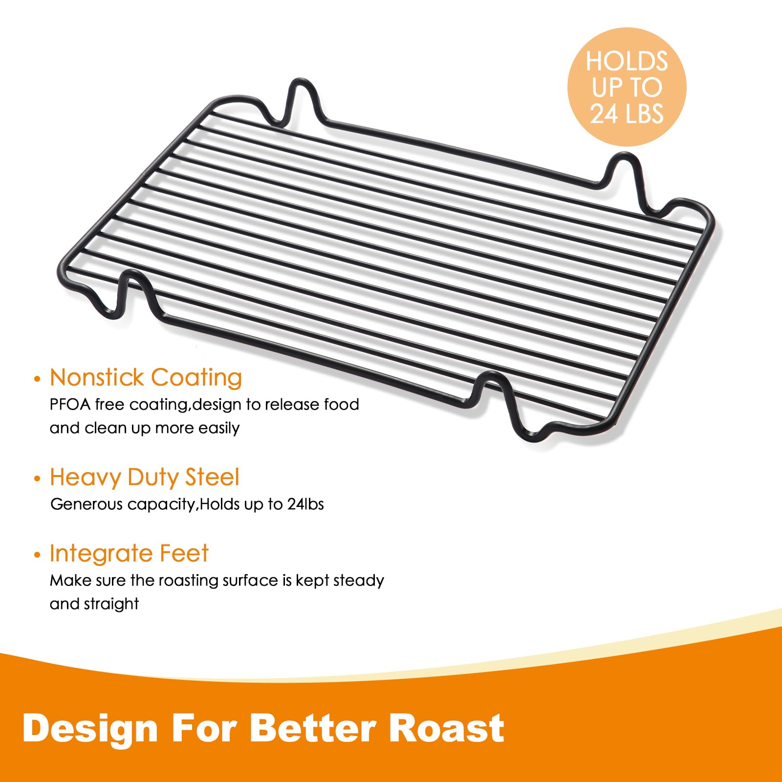 - ROASTING RACK FOR WIDELY USE:With food grade non-stick coating,GESTONE roasting rack is fit for baking pans or pots of the sizes bigger than 13inch. The turkey rack for roasting pan is designed to roast all kinds of meat without sticking the food to the baking dish or roaster,and safe for oven-use up to 575degF. Baking Racks for Oven Use is a great tool to help you to roast, bake, grill, smoke, dry and bbq in ease.