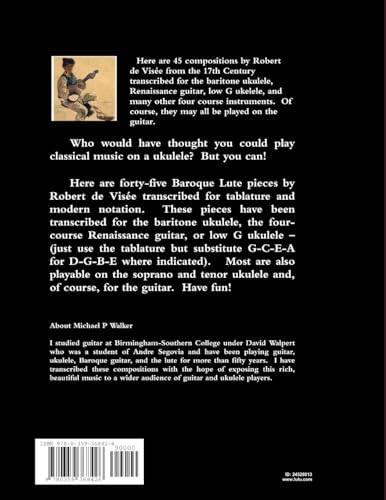 Here are 45 compositions by Robert de Visee from the 17th Century transcribed for the baritone ukulele, Renaissance guitar, low G ukelele, and many other four course instruments. Of course, they may all be played on the guitar.