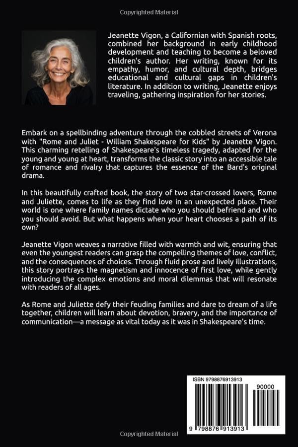 Embark on a spellbinding adventure through the cobbled streets of Verona with “Romeo and Juliet – William Shakespeare for Kids” by Jeanette Vigon. This charming retelling of Shakespeare’s timeless tragedy, adapted for the young and young at heart, transforms the classic story into an accessible tale of romance and rivalry that captures the essence of the Bard’s original drama. In this beautifully crafted book, the story of two star-crossed lovers, Romeo and Juliet, comes to life as they find love in an unexpected place. Their world is one where family names dictate who you should befriend and who you should avoid. But what happens when your heart chooses a path of its own? Jeanette Vigon weaves a narrative filled with warmth and wit, ensuring that even the youngest readers can grasp the compelling themes of love, conflict, and the consequences of choices. Through fluid prose and lively illustrations, this story portrays the magnetism and innocence of first love, while gently introducing the complex emotions and moral dilemmas that will resonate with readers of all ages. As Romeo and Juliet defy their feuding families and dare to dream of a life together, children will learn about devotion, bravery, and the importance of communication–a message as vital today as it was in Shakespeare’s time. Perfect for bedtime reading or as an engaging classroom text, “Romeo and Juliet – William Shakespeare for Kids” by Jeanette Vigon promises to enchant with its balance of earnest storytelling and lighthearted moments. It’s a captivating introduction to one of literature’s greatest love stories, retold with care and creativity for the next generation of dreamers and star-gazers. Come, be whisked away to a place where ancient feuds can’t quench the spirit of youth and love, and discover that even the greatest tales can find new life through the eyes of a child. Add “Romeo and Juliet” to your collection today and let the wonder of Shakespeare inspire your little ones to love, laugh, and live vibrantly!