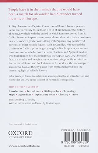 “People have it in their minds that he would have been a match for Alexander, had Alexander turned his arms on Europe.” Here is a superb new translation of Books 6 to 10 of Livy’s monumental history of Rome, covering the period when Rome, in a series of ever greater wars, imposed mastery over virtually the entire Italian peninsula. Livy paints vivid portraits of all the notable figures, such as young Manlius Torquatus, victor in a David-versus-Goliath duel with a Gallic chieftain, and Appius Claudius who built Rome’s first major highway, the Appian Way. Livy’s blend of factual narrative and imaginative recreation brings to life a key moment in the rise of Rome, and the one complete account we have, as the city passes from the mists of legend into the light of history. J. C. Yardley’s translation gives a vivid sense of the energy, variety, and literary skill of Livy’s great work. Dexter Hoyos’s Introduction sets Livy in the context of Roman historiography and deftly explains why this period was so critical an era for the rise of Rome. The most up-to-date edition, drawing on the latest scholarship, this major work of Roman literature and history includes comprehensive notes that clarify problems of historical content, topography, and chronology, a detailed glossary of Roman technical terms, an appendix on the Roman legion of the time, and two maps. About the Series: For over 100 years Oxford World’s Classics has made available the broadest spectrum of literature from around the globe. Each affordable volume reflects Oxford’s commitment to scholarship, providing the most accurate text plus a wealth of other valuable features, including expert introductions by leading authorities, voluminous notes to clarify the text, up-to-date bibliographies for further study, and much more.