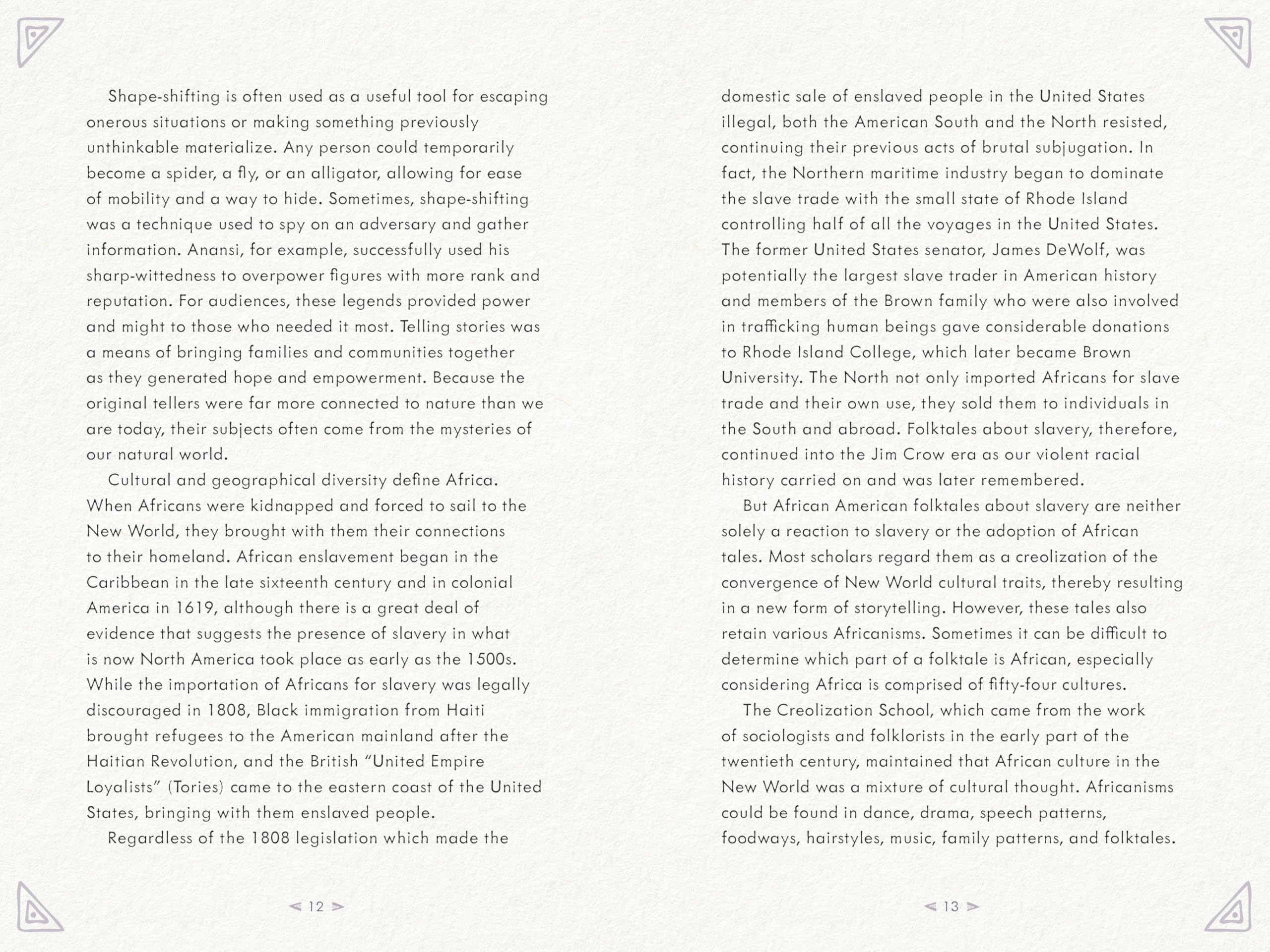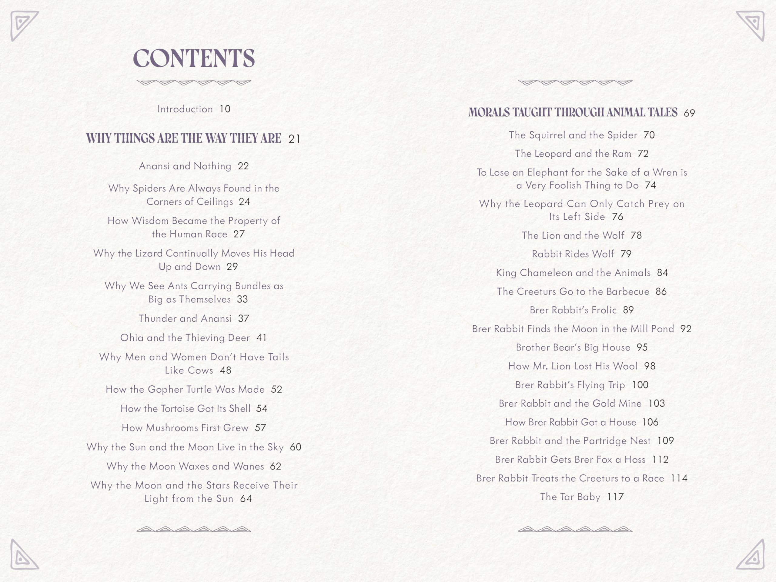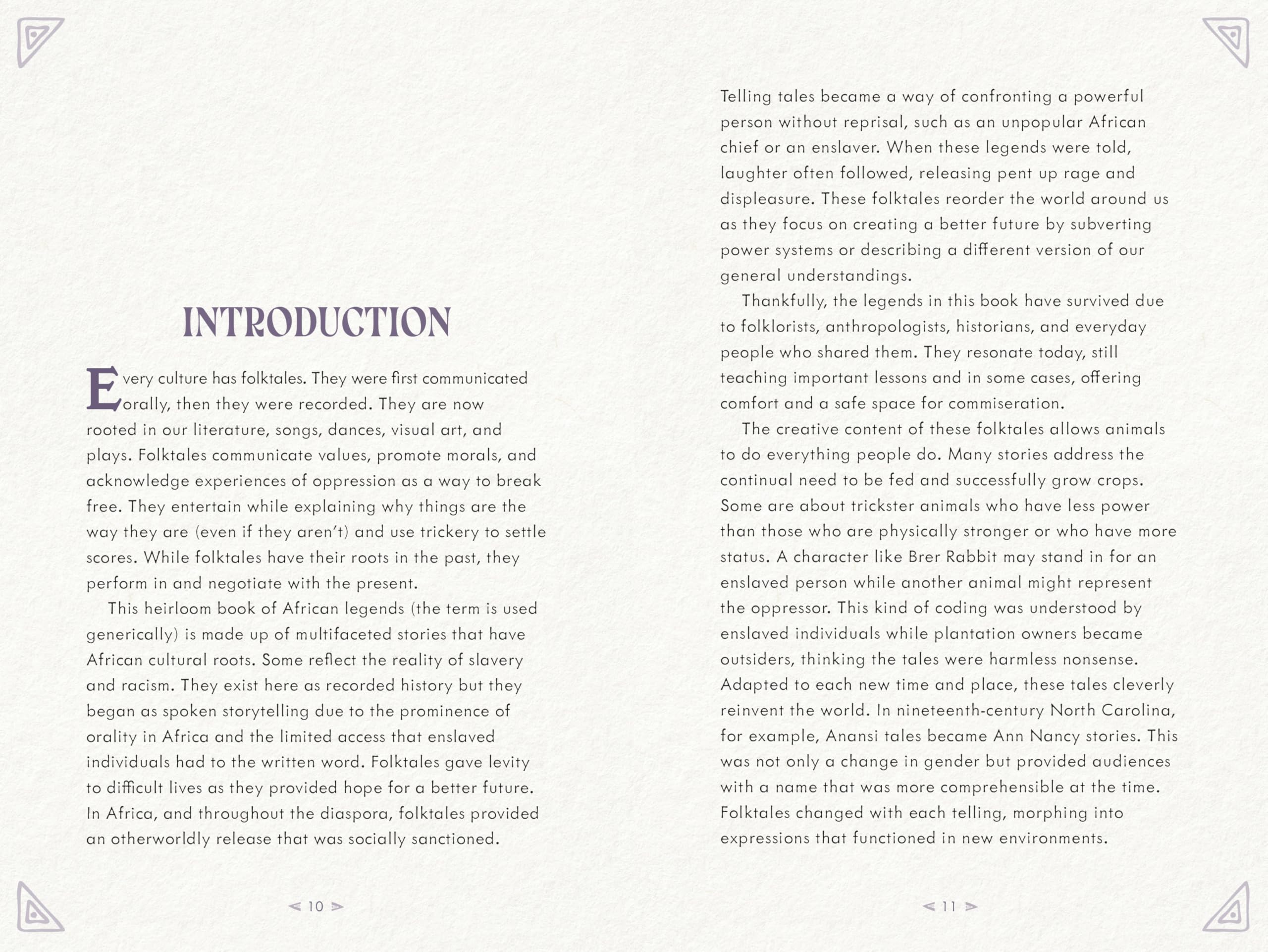 Pass down the powerful teachings of African oral tradition by adding this luxe illustrated volume of over 50 cultural folktales to your home library. In this captivating collection of folklore from African culture, discover the stories that have been passed down through generations and continue to teach valuable lessons today through their vibrant, illustrative language. With over 50 folktales, Roots and Legends celebrates the richness of African customs and life, and champions the importance of oral tradition, a practice that rose up through the dark times of slavery and oppression. Thoughtfully curated and richly illustrated, Roots and Legends features the wonder and educational lessons of cultural stories and figures such as: Why Spiders Are Always Found in the Corners of Ceilings How the Tortoise Got Its Shell Why the Sun and the Moon Live in the Sky How Mr. Lion Lost His Wool Brother Bear’s Big House Brer Rabbit and the Gold Mine Morning Sunrise Diddy-Wah-Diddy Uncle Monday A Ghost Story About an Aunt Farmer Mybrow and the Fairies And more! Divided into four sections (Why Things Are the Way They Are; Morals Taught through Animals Tales; Bearing Witness; and People with Unusual Powers) covering the spiritual nature of animals, people, the land and its sometimes spooky inhabitants, and more, each page is filled with timeless tales of heroes, tricksters, and everyday wisdom, and invites you to immerse yourself in the depth and beauty of African folklore. Featuring historic stories with a modern editorial review, this deluxe collectible edition includes original illustrations and an embellished, giftable package. A perfect choice for families interested in passing down African heritage through storytelling traditions, Roots and Legends will enchant readers of all ages through its beautifully illustrated and accessible collection of folklore.