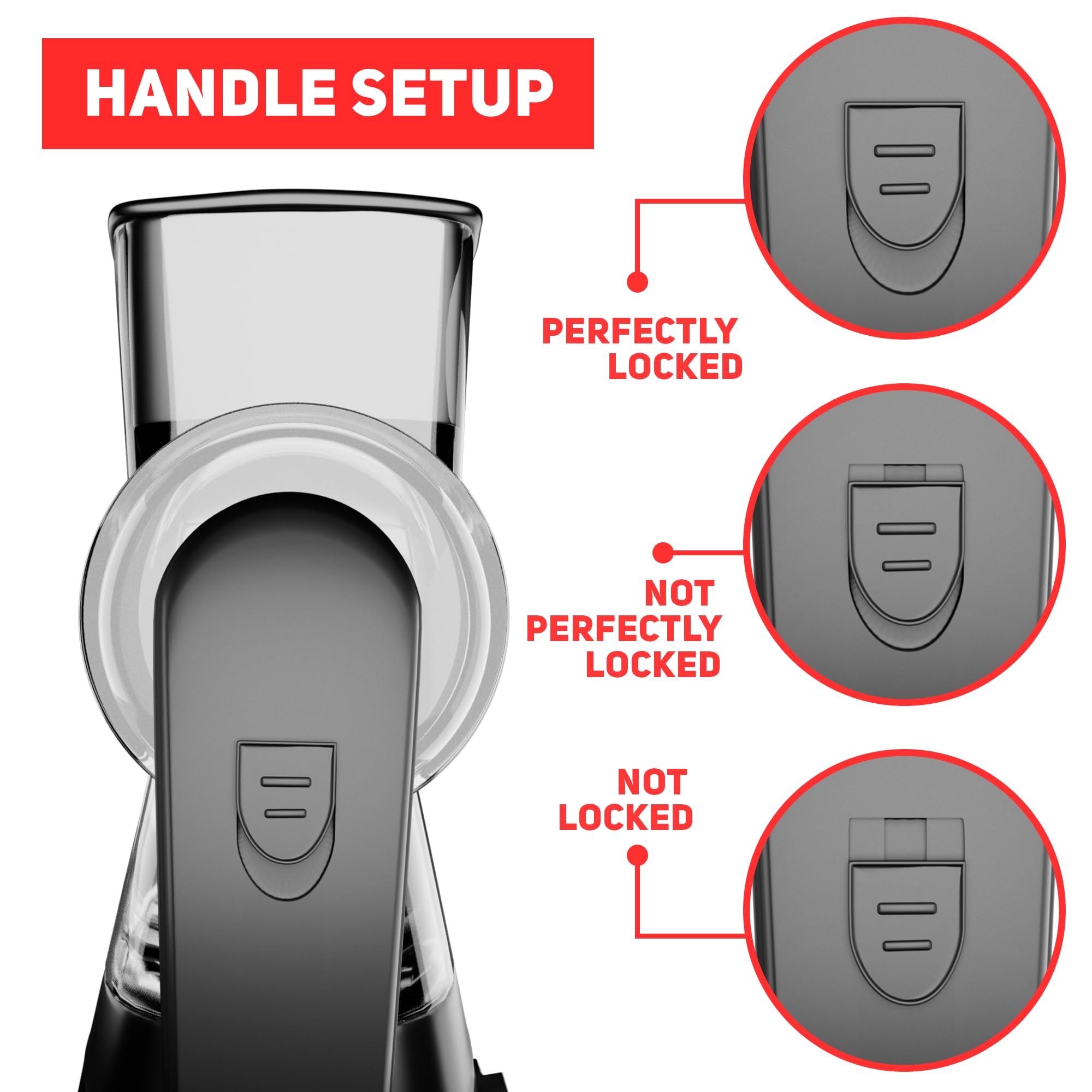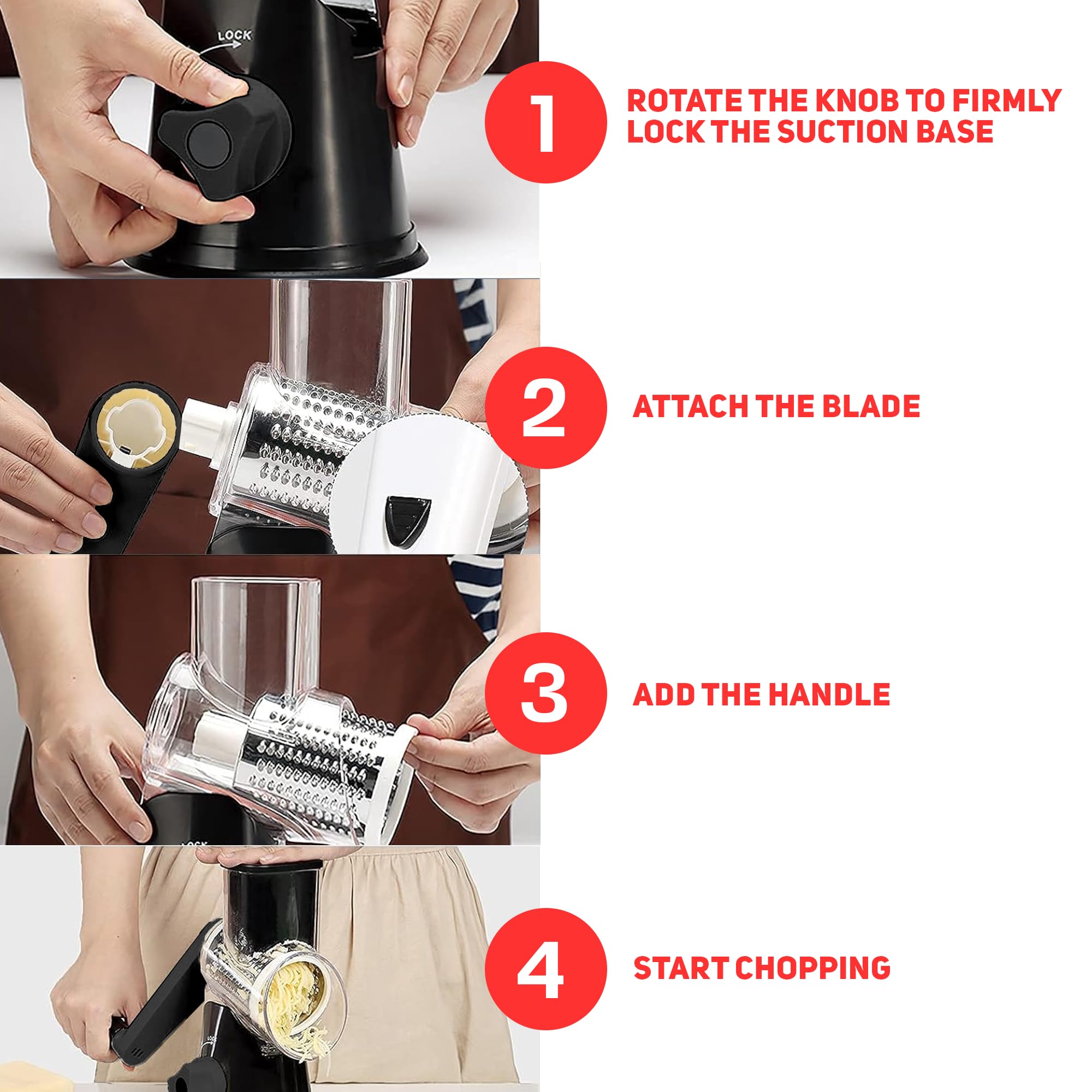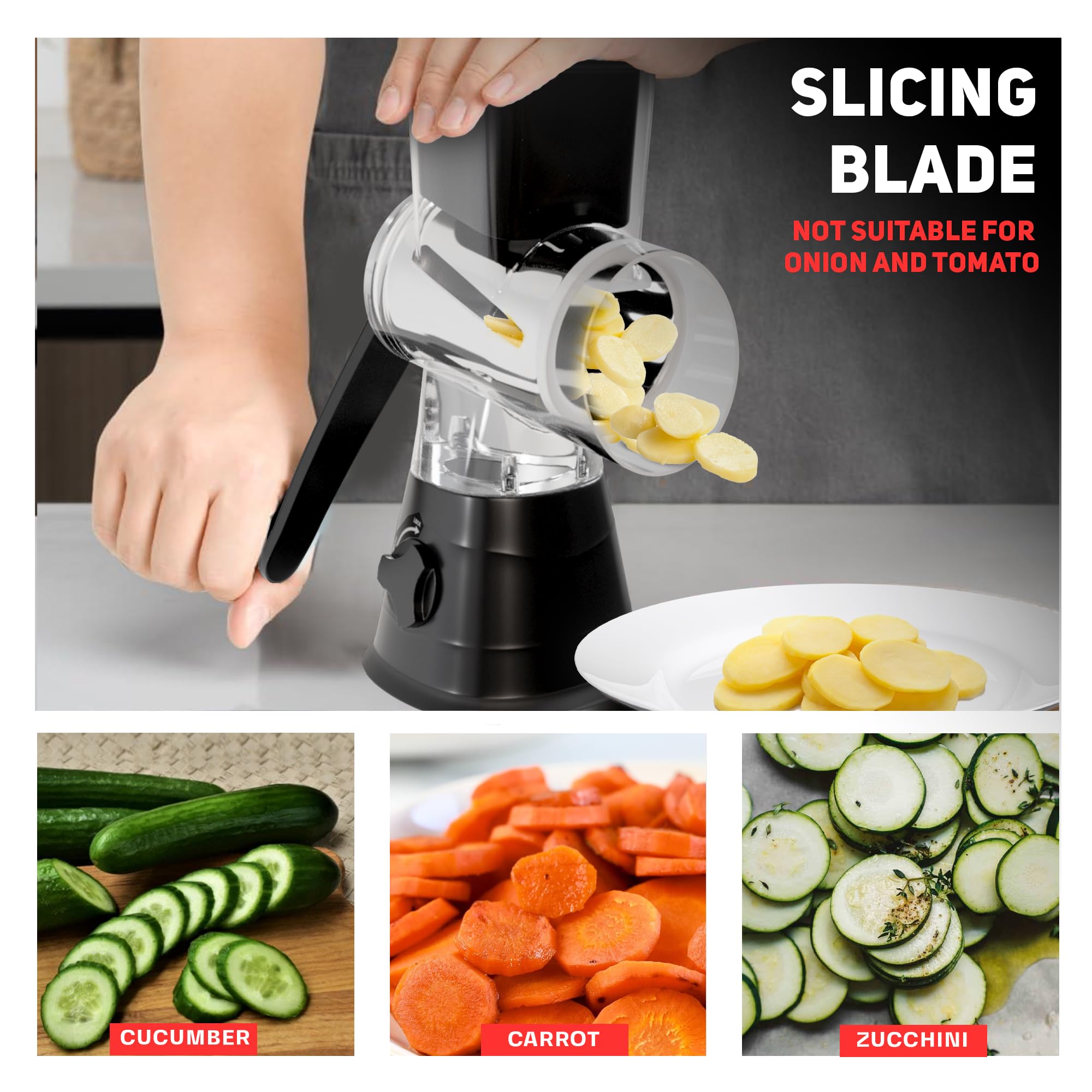 - [STURDY AND SAFETY] Featuring a strong suction base, our rotary grater stays securely in place on smooth countertops, preventing slips during use. The handle design keeps your hands away from the blades, offering a safer grating experience.