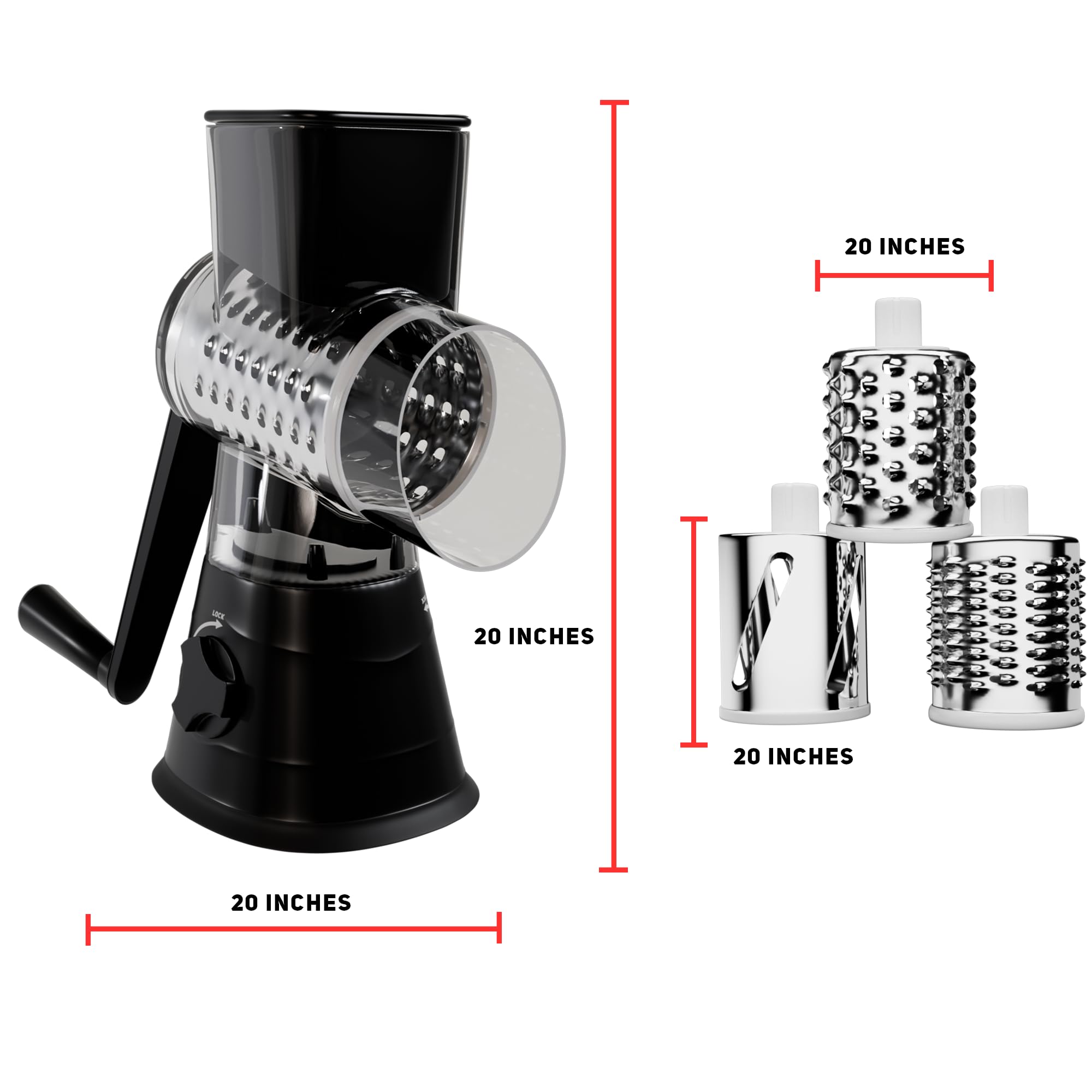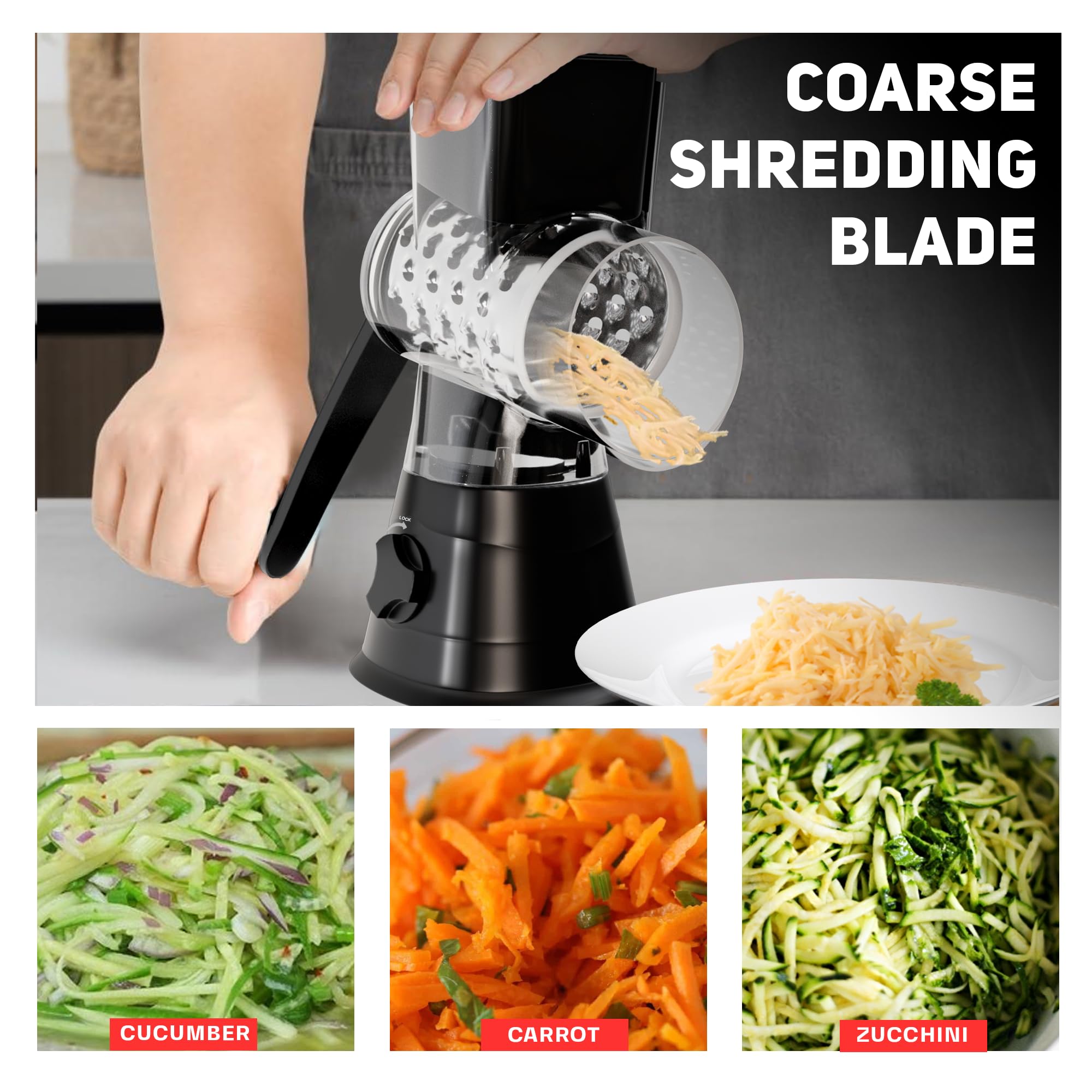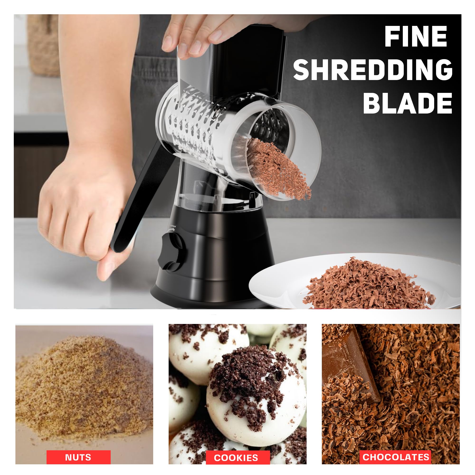 - [3 BLADES] Equipped with three interchangeable blades–slicing, coarse shredding, and fine shredding–our rotary cheese grater adapts to various kitchen tasks. Whether you need to slice vegetables, shred cheese, or grate nuts, these versatile blades make food prep effortless.