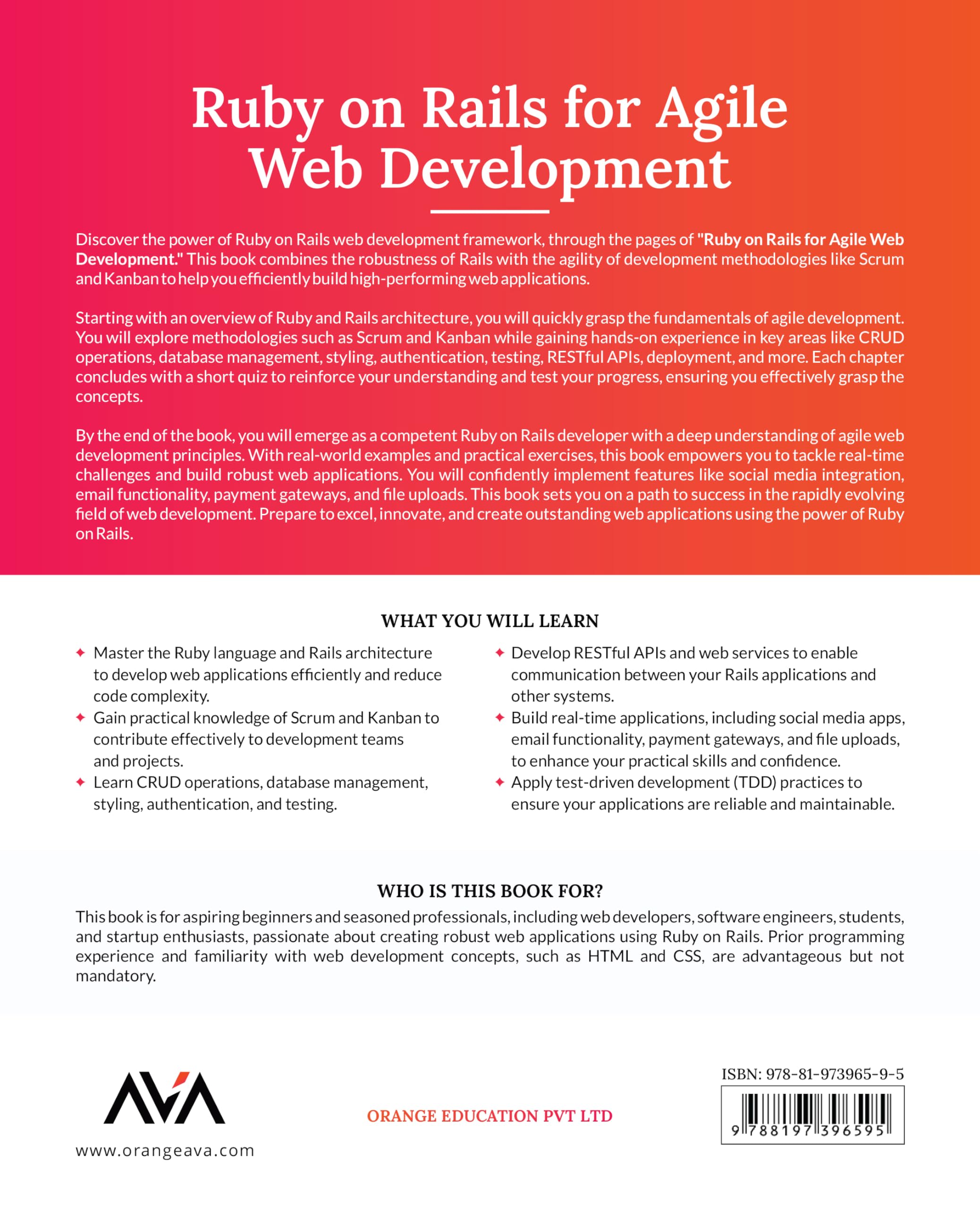 Master the Art of Agile Development with Ruby on Rails Book Description Discover the power of Ruby on Rails web development framework, through the pages of “Ruby on Rails for Agile Web Development”. This book combines the robustness of Rails with the agility of development methodologies like Scrum and Kanban to help you efficiently build high-performing web applications. Starting with an overview of Ruby and Rails architecture, you will quickly grasp the fundamentals of agile development. You will explore methodologies such as Scrum and Kanban while gaining hands-on experience in key areas like CRUD operations, database management, styling, authentication, testing, RESTful APIs, deployment, and more. Each chapter concludes with a short quiz to reinforce your understanding and test your progress, ensuring you effectively grasp the concepts. By the end of the book, you will emerge as a competent Ruby on Rails developer with a deep understanding of agile web development principles. With real-world examples and practical exercises, this book empowers you to tackle real-time challenges and build robust web applications. You will confidently implement features like social media integration, email functionality, payment gateways, and file uploads. Table of Contents 1. Introduction 2. Agile Development Fundamentals 3. Getting Started with Ruby on Rails 4. CRUD Operations and Database Management 5. Basics of Styling and Front-End Development 6. Authentication and Authorization 7. Testing and Test-Driven Development 8. RESTful APIs and Web Services 9. Deployment and Scaling 10. Building A Real-World Rails Application 11. Advanced Topics in Ruby on Rails 12. Conclusion Index