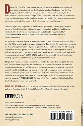 During the Civil War, cities, houses, forests, and soldiers’ bodies were transformed into “dead heaps of ruins,” novel sights in the southern landscape. How did this happen, and why? And what did Americans–northern and southern, black and white, male and female–make of this proliferation of ruins? Ruin Nation is the first book to bring together environmental and cultural histories to consider the evocative power of ruination as an imagined state, an act of destruction, and a process of change. Megan Kate Nelson examines the narratives and images that Americans produced as they confronted the war’s destructiveness. Architectural ruins–cities and houses–dominated the stories that soldiers and civilians told about the “savage” behavior of men and the invasions of domestic privacy. The ruins of living things–trees and bodies–also provoked discussion and debate. People who witnessed forests and men being blown apart were plagued by anxieties about the impact of wartime technologies on nature and on individual identities. The obliteration of cities, houses, trees, and men was a shared experience. Nelson shows that this is one of the ironies of the war’s ruination–in a time of the most extreme national divisiveness people found common ground as they considered the war’s costs. And yet, very few of these ruins still exist, suggesting that the destructive practices that dominated the experiences of Americans during the Civil War have been erased from our national consciousness.