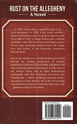 Winner of the Independent Publisher Awards Bronze Medal for Best Regional Fiction A multi-generation family saga set in a Pennsylvania town that changed the world. In 2019, a man takes a copyediting job at his local newspaper. In 1939, a boy stands outside a theater and hatches a plan to sneak in. And on a cold, rainy night in 1982, a college student gives a bloodied hitchhiker a ride. Not one of these individuals is aware of how these seemingly isolated events will change their lives forever, or the inexorable connections between them. Rust on the Allegheny is a cozy historical fiction novel told through the shifting perspectives of multiple generations of the MacCulloch family, a bloodline said to be cursed by perennial misfortune. It is the story of one family’s messy and at times dysfunctional relationship with their hometown of Latonia City, Pennsylvania, where moldering Victorian manors and empty art deco theaters chronicle the rich heritage and industrial downturn of America’s Rust Belt, with glimpses of hope for the future.