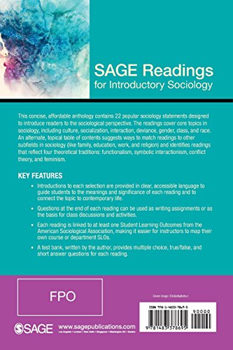 SAGE Readings for Introductory Sociology is a concise, affordable anthology that contains 22 popular sociology statements designed to introduce readers to the sociological perspective. Kimberly McGann puts together readings that cover core topics in sociology, including culture, socialization, interaction, deviance, gender, class, and race. An alternate, topical table of contents suggests ways to match readings to other subfields in sociology (like family, education, work, and religion), and identifies readings that reflect four theoretical traditions: functionalism, symbolic interactionism, conflict theory, and feminism.