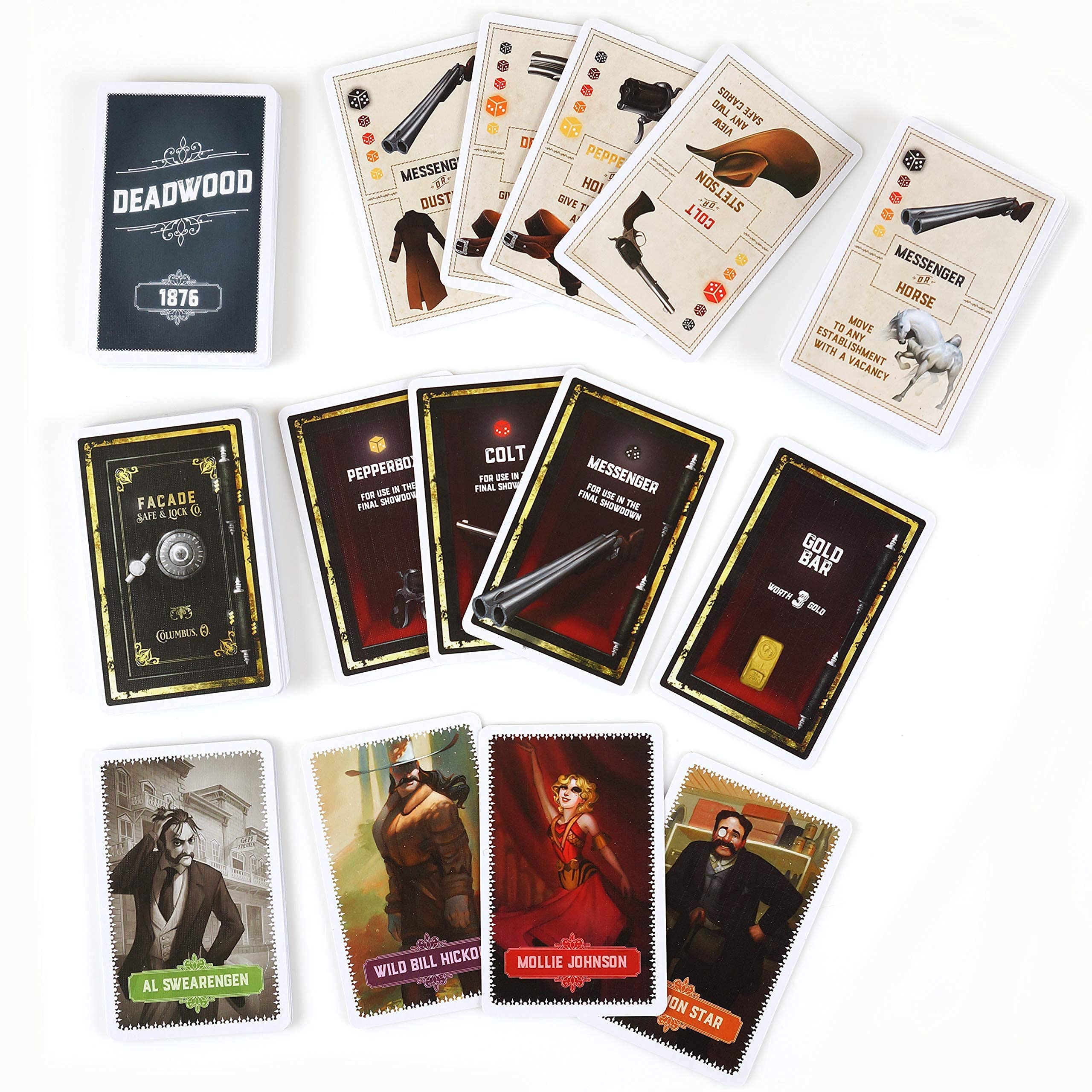 - WESTERN GAME: Deadwood 1876 is a 20-40 min game for 2-9 players ages 13 & up. Includes a magnetic faux book box, bag, 9 star pawns, 3 platforms, 10 dice, 50 cards, 9 character cards, & 25 safe cards.