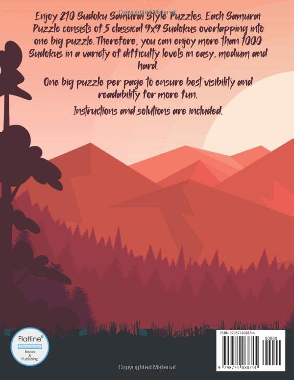 Do you enjoy logic puzzles like classical Sudokus? Then get ready for the next level of fun with Samurai Sudoku Puzzles! Samurai Style Sudoku Puzzles consist of 5 classical 9×9 Sudokus overlapping into one big puzzle. Therefore, you can enjoy more than 1000 Sudokus in a variety of difficulty levels in easy, medium and hard. One big puzzle per page to ensure best visibility and readability for more fun. Book Features: 1.050 Sudoku Puzzles overlapping into 200 Samurai Style Puzzles Easy, medium and hard levels with 70 puzzles respectively Large print – one puzzle per page and double-sided print on white paper Solutions at the end of the book For adults, teens and clever kids Size: 8.5 x 11 inch