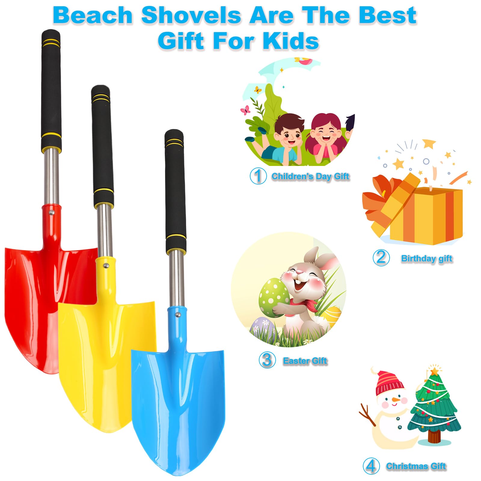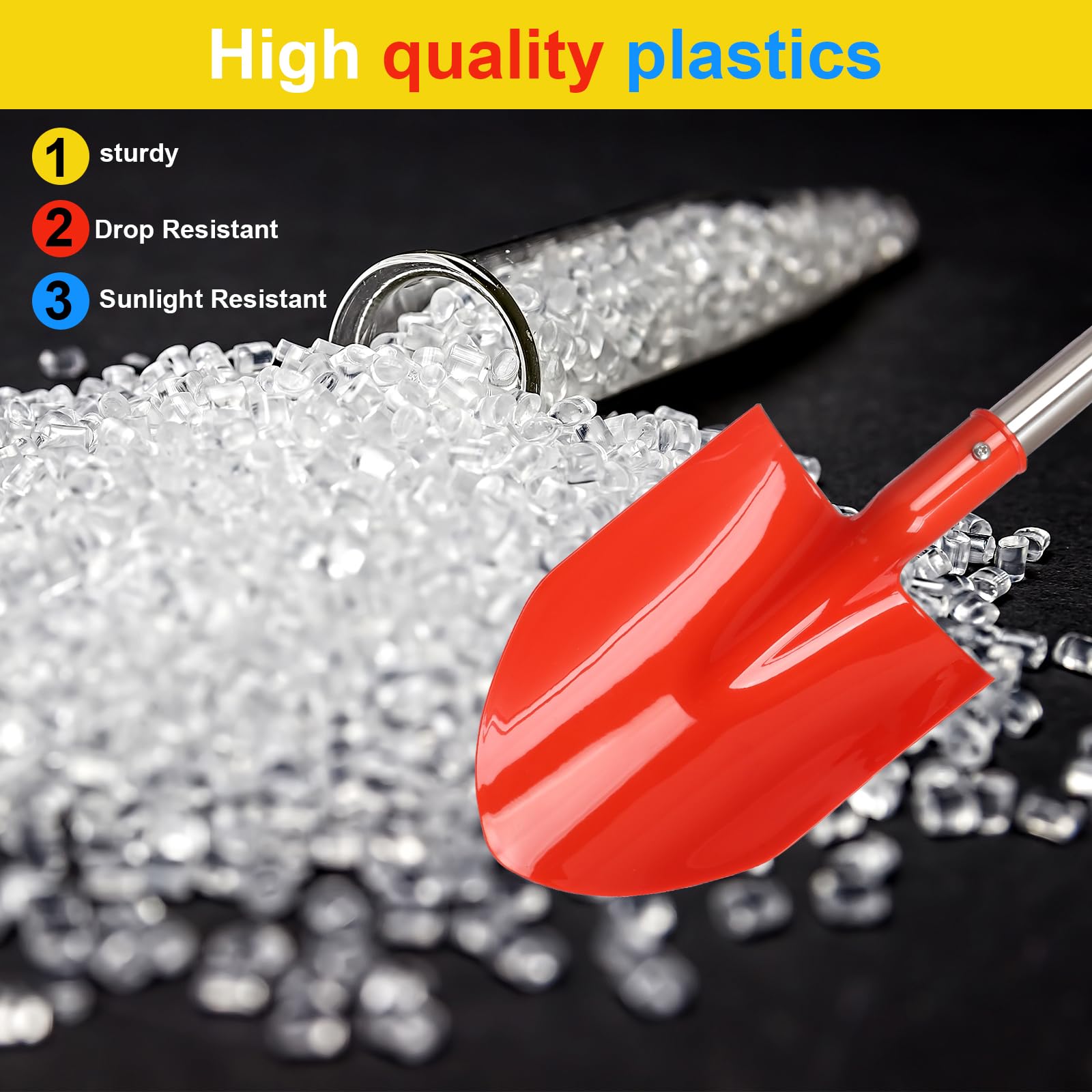• 1.QUALITY MATERIAL: sand shovels for kids long handle head of the spatula is made of kid’s favourite thickened plastic, kids shovels for digging plastic edges are polished very smooth to keep you away from poor quality plastic cutting your hands. children beach shovels tube is made of sturdy stainless steel and sponge sleeve, this can keep your hand free from wear and tear.