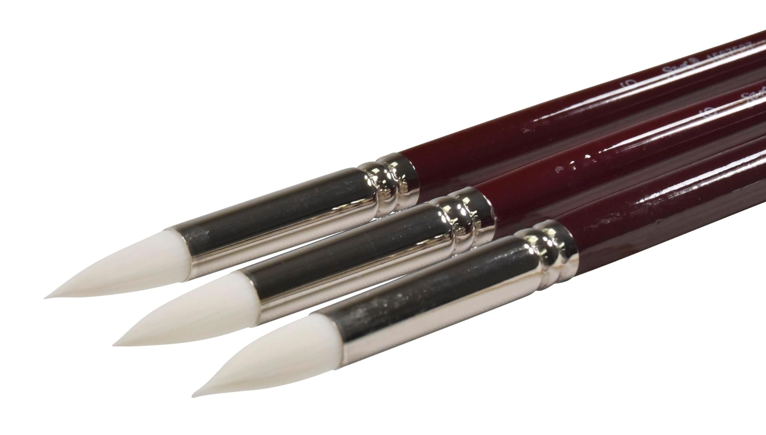 • Round brushes are great for detailed work, thick paint application, and controlled washes