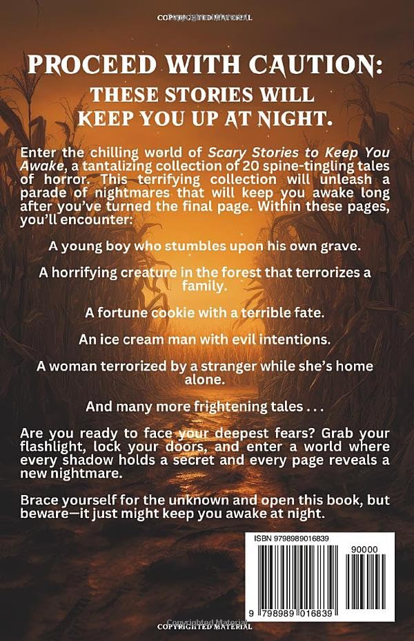PROCEED WITH CAUTION: These stories will keep you up at night. Enter the chilling world of Scary Stories to Keep You Awake, a tantalizing collection of 20 spine-tinging tales of horror. This terrifying collection will unleash a parade of nightmares that will keep you awake long after you’ve turned the final page. Within these pages, you’ll encounter: A young boy who stumbles upon his own grave. A horrifying creature in the forest that terrorizes a family. A fortune cookie with a terrible fate. An ice cream man with evil intentions. A woman terrorized by a stranger while she’s home alone. And many more frightening tales . . . Are you ready to face your deepest fears? Grab your flashlight, lock your doors, and enter a world where every shadow holds a secret and every page reveals a new nightmare. Brace yourself for the unknown and open this book, but beware–it just might keep you awake at night. Also available! Scary Stories to Give You Chills Scary Stories to Haunt Your Dreams