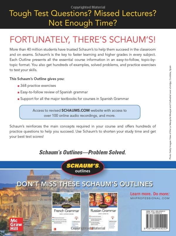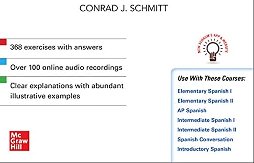 Publisher’s Note: Products purchased from Third Party sellers are not guaranteed by the publisher for quality, authenticity, or access to any online entitlements included with the product. Tough Test Questions? Missed Lectures? Not Enough Time? Textbook too Pricey? Fortunately, there’s Schaum’s. More than 40 million students have trusted Schaum’s to help them succeed in the classroom and on exams. Schaum’s is the key to faster learning and higher grades in every subject. Each Outline presents all the essential course information in an easy-to-follow, topic-by-topic format. You also get hundreds of examples, solved problems, and practice exercises to test your skills. Schaum’s Outline of Spanish Grammar, Seventh Edition is packed with clear, logical explanations that will help you build linguistic competency in Spanish. This updated edition provides expanded coverage of special verb forms and verb usages unique to Latin America to match the latest high school and college courses. Schaum’s Outline of Spanish Grammar, Seventh Edition features: * 368 practice exercises with answers * An accessible review of Spanish grammar * Verbal charts and quick drills to hone your skills * 10-page appendix reflecting the latest developments in Spanish courses * Support for all the major textbooks for Spanish courses * Content that is appropriate for Elementary Spanish I, Elementary Spanish II, Intermediate Spanish I, and Intermediate Spanish II courses PLUS: Access to the revised Schaums.com website and app, with over 2.5 hours of downloadable audio files, and more. Schaum’s reinforces the main concepts required in your course and offers hundreds of practice exercises to help you succeed. Use Schaum’s to shorten your study time-and get your best test scores! Schaum’s Outlines — Problem solved.