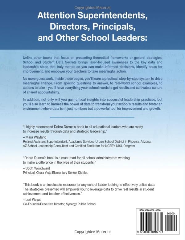 Attention Superintendents, Directors, Principals, and Other School Leaders: Unlike other books that focus on presenting theoretical frameworks or general strategies, School and Student Data Secrets brings laser-focused awareness to the key data and leadership steps that truly matter, so you can make informed decisions, identify areas for improvement, and empower your teachers to take meaningful action. No more guesswork. Inside these pages, you’ll learn a practical, step-by-step system to drive meaningful change. From specific questions to answer, to real-world school examples, to actions to take – you’ll have everything your school needs to get results and cultivate a culture of shared accountability. In addition, not only will you gain critical insights into successful leadership practices, but you’ll also learn to harness the power of data to transform your school’s results and foster an environment where data isn’t just numbers but a powerful tool for improvement and growth. “I highly recommend Debra Durma’s book to all educational leaders who are ready to increase results through data and strategic leadership.” – Mara Wayland Retired Assistant Superintendent, Academic Services-Urban School District in Phoenix, Arizona; AZ School Leadership Consultant and Certified Facilitator for NCEE’s NISL Program “Debra Durma’s book is a must read for all school administrators working to make a difference in the lives of their students.” – Scott Woodward Principal, Chula Vista Elementary School District “This book is an invaluable resource for any school leader looking to effectively utilize data. The strategies presented will empower you to leverage data to drive real results in student achievement and teacher effectiveness.” – Lori Weiss Co-Founder/Executive Director, Synergy Public School