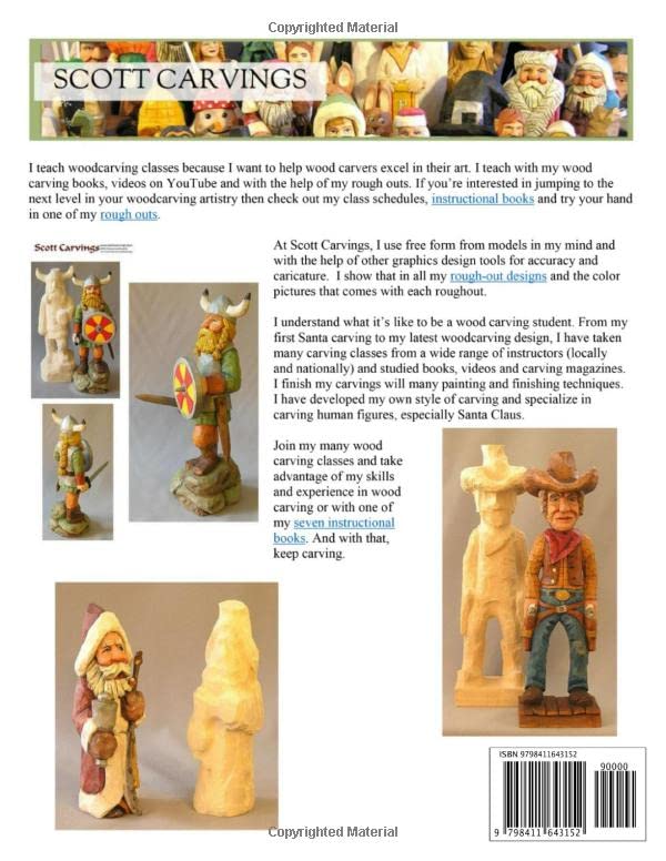 *NOTE* This is a paperback book of my FREE Scott Carving patterns found on my ScottCarvings.com website. The links to my FREE wood carving patterns are found on my occasional newsletter for those who have subscribed. I’ve created this paperback book for those who like to have these patterns and not print out the FREE patterns themselves. Go to ScottCarvings.com or visit one of my videos at YouTube.com/user/ScottCarvings. Scott Carvings Free Patterns Book is packed with nine Halloween and Christmas wood carving projects, with step-by-step pictures of how to carve the Santa face, eyes, and ears. The rest comes with patterns, and color pictures of how the carving looks like. Though you can change the pattern size to fit the wood you have and/or paint your wood carving any way you choose, these pictures help you come up with a carving the way I carve and paint them, or any way you want. Have fun carving these wood carvings from the patterns. Keep your finished works or present them to your family or friends. Also, watch my YouTube videos on carving Santas and other figures to help improve your techniques. Have fun carving – and watch for more books and patterns from Scott Carvings and have fun creating.