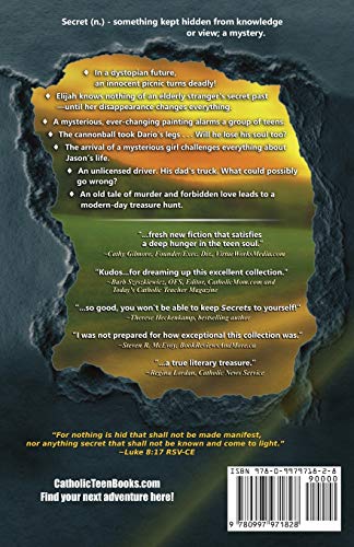 Secrets: Visible and Invisible is a collection of short stories by seven CatholicTeenBooks.com authors. As described by Mark Hart of Life Teen International, who provides the foreword, “Each story reveals something different about the human heart and our constant (though, often veiled) desire for truth and virtue.” Secret (n.) – something kept hidden from knowledge or view; a mystery. In a dystopian future, an innocent picnic turns deadly! Elijah knows nothing of the elderly stranger’s secret past–until her disappearance changes everything. A mysterious, ever-changing painting alarms a group of teens. The cannonball took Dario’s legs . . . Will he lose his soul too? The arrival of a mysterious girl challenges everything about Jason’s life. An unlicensed driver. His dad’s truck. What could possibly go wrong? An old tale of murder and forbidden love leads to a modern day treasure hunt. For nothing is hid that shall not be made manifest, nor anything secret that shall not be known and come to light. (Luke 8:17 RSV-CE)