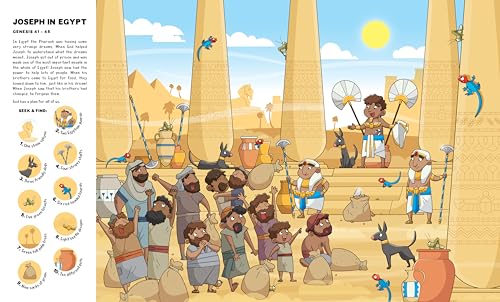 Seek-and-find book exploring eight more Old Testament stories, the characters within them and the character of our amazing God. Seek & Find: More Old Testament Bible Stories contains eight more stories from the Old Testament with over 450 hidden things for young children to find, count, and sort as they interact with the Bible stories. Both the retellings and illustrations are biblically faithful and children will learn all about eight well-known Old Testament characters, including Joseph, Elijah and Esther. These are the Old Testament stories featured and the attributes of God they highlight: Welcome – How to Enjoy This Book Abraham and Sarah – God Is a Promise-Keeper Joseph’s Dream – We Can Trust God When Things Are Hard Joseph in Egypt – God Has a Plan for All of Us The Red Sea – Nothing Is Too Hard for God Strong Samson – God Is Our Strength Elijah and the Fire – God Is the One True God Songs for God (Psalm 23) – God Loves Us to Talk to Him Brave Esther – God Is Always in Control