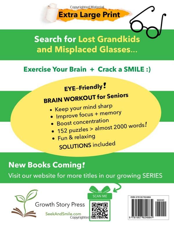 WARNING: Joy, Smiles and Laughter inside! Search for Lost Grandkids and Misplaced Glasses… Senior-themed word search puzzles Fun and relaxing — HOURS of stress relief and entertainment Approx.2000 Words 152 Puzzles 180 Pages EXTRA LARGE JUMBO PRINT = EYE-friendly GIANT letters — extra large type, LARGER than most Large Print Wide margins — easy to tear out Puzzle & Words on the SAME PAGE — no need to turn pages back and forth for word lists BIG clear design reduces eye strain Large size 8.5″x11″ Word lists in alphabetical order SOLUTIONS (answers in back) Healthy Mind + BRAIN WORKOUT! Keep your mind sharp Improve focus Strengthen memory Boost concentration Protect mental acuity GREAT GIFT for Adults, Seniors, and Aging EYES Enjoy ANYTIME, ANYWHERE — fun with friends and family, your morning coffee, relaxing on vacation, at the doctor’s office! Exercise the brain + crack a SMILE Grab your copy today!