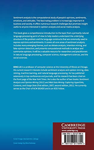 Sentiment analysis is the computational study of people’s opinions, sentiments, emotions, and attitudes. This fascinating problem is increasingly important in business and society. It offers numerous research challenges but promises insight useful to anyone interested in opinion analysis and social media analysis. This book gives a comprehensive introduction to the topic from a primarily natural-language-processing point of view to help readers understand the underlying structure of the problem and the language constructs that are commonly used to express opinions and sentiments. It covers all core areas of sentiment analysis, includes many emerging themes, such as debate analysis, intention mining, and fake-opinion detection, and presents computational methods to analyze and summarize opinions. It will be a valuable resource for researchers and practitioners in natural language processing, computer science, management sciences, and the social sciences.
